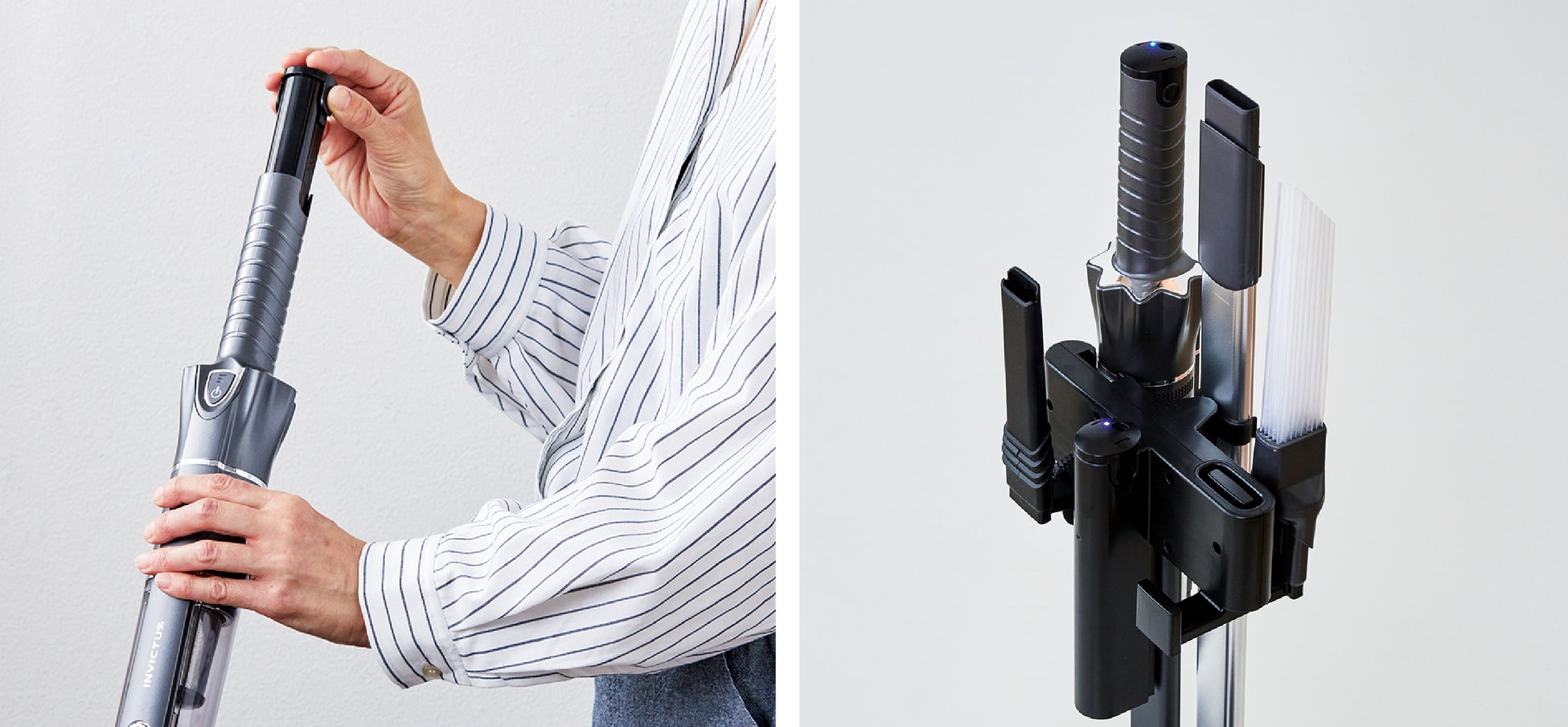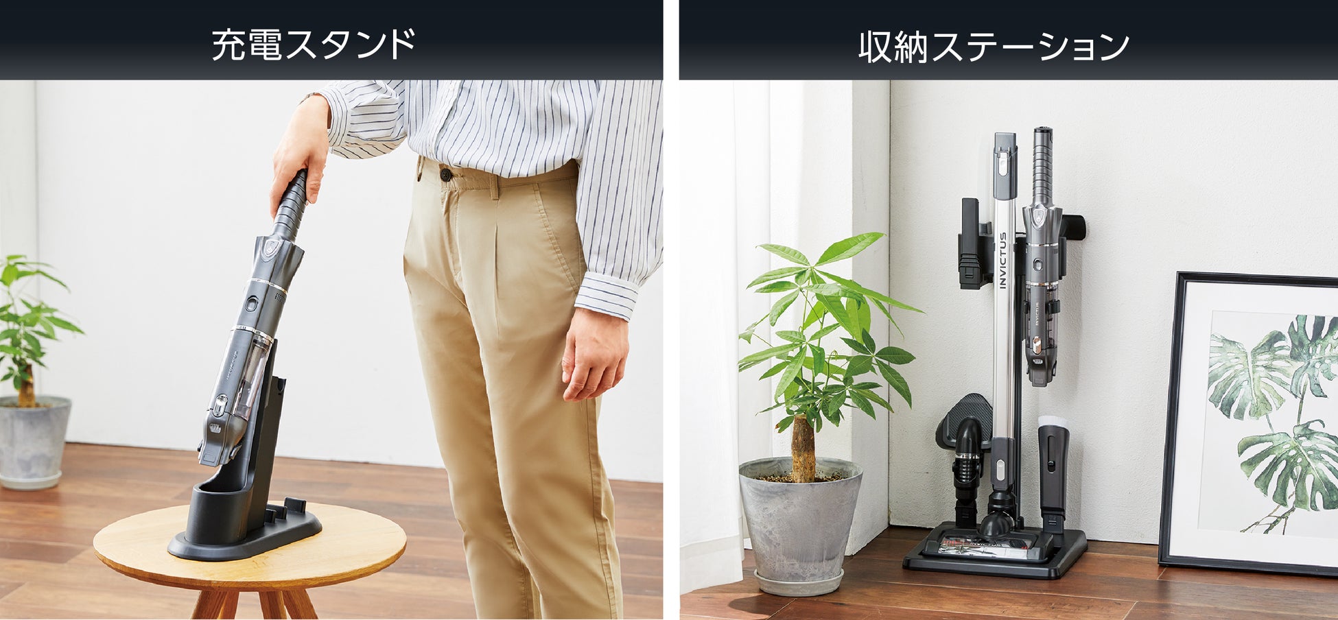 専用の充電スタンドで卓上収納に加え、自立式の専用収納ステーション※があればすべてのアタッチメントをまとめて収納できるうえ、本体と交換バッテリー※の2本も同時に充電が可能に。※別売り品