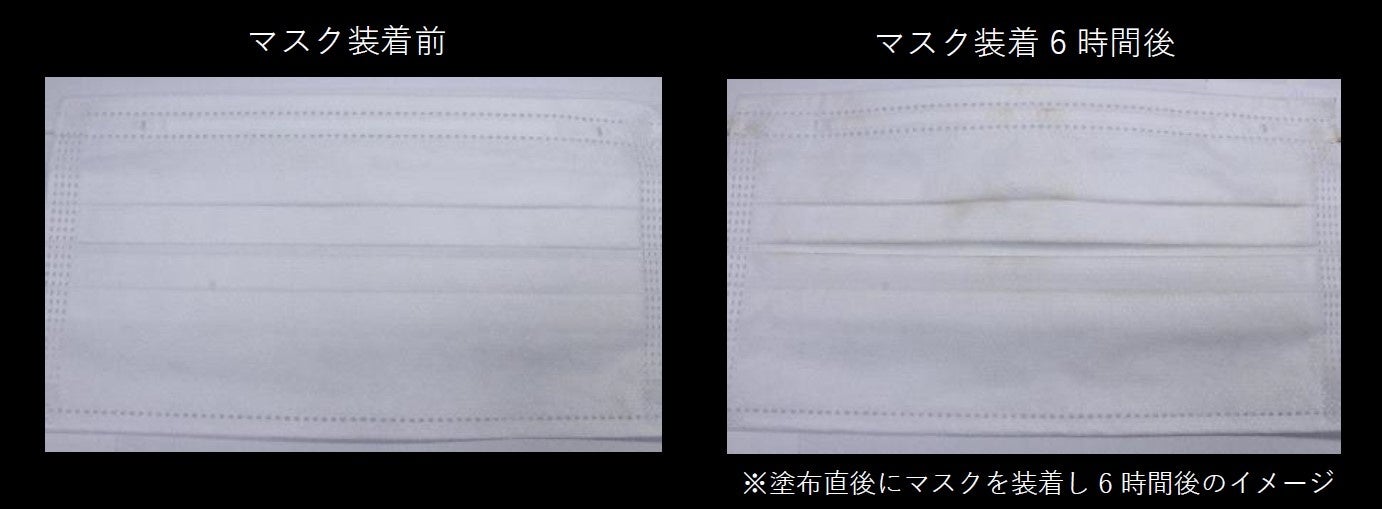 目視で検証:顔全体にベースカラーコントローラーH01 を塗布直後にマスクを装着し 6 時間後、マスクをデジタルカメ ラで撮影し化粧移りの有無を目視評価。
