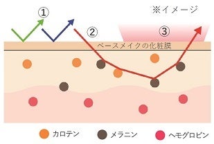 3. 肌内部から赤色の光が反射し、ベースメイクのカバー膜の上に纏うことで、血色感のある男性の肌でのカバー力の高さと自然な仕上がりを両立。