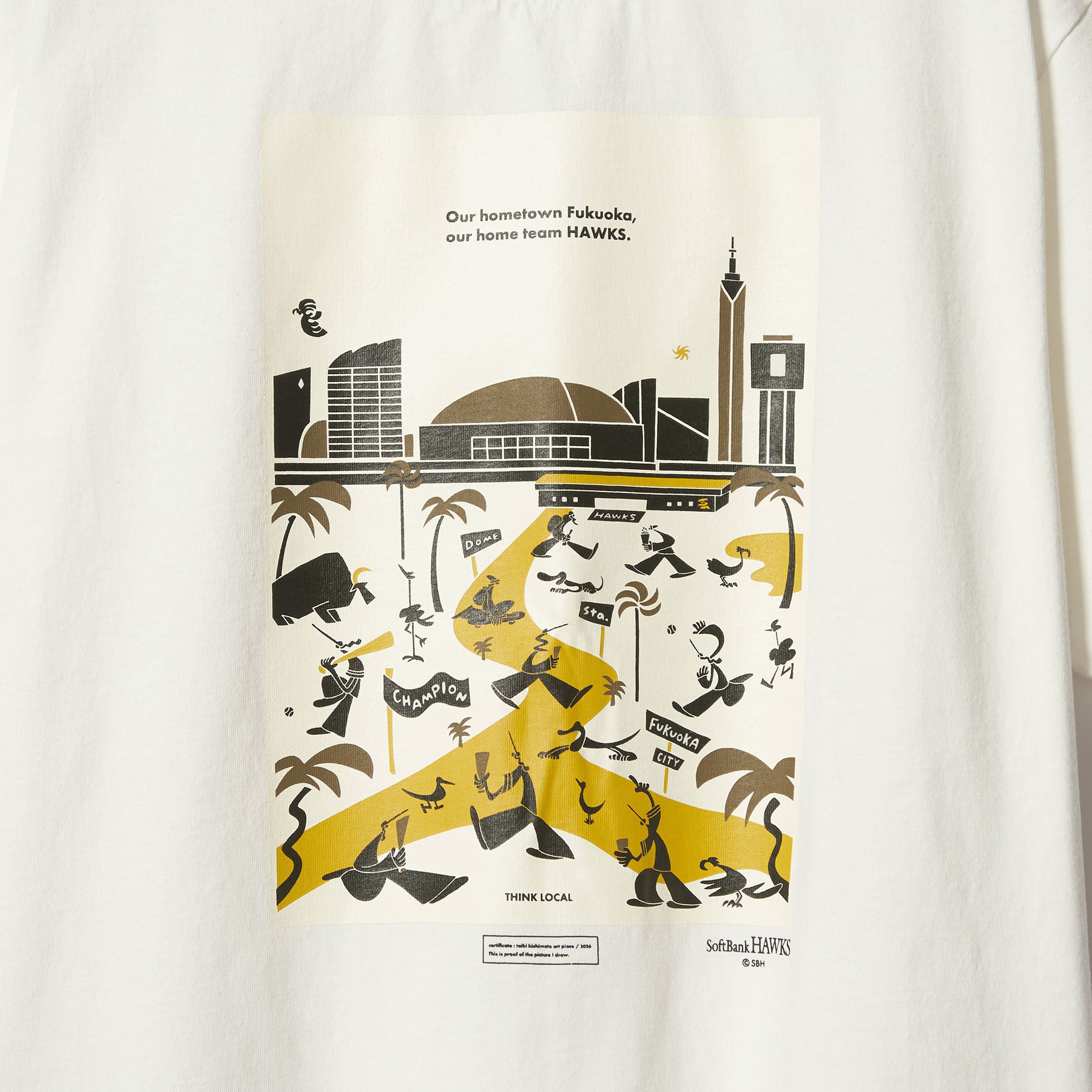 みずほPayPayドーム福岡周辺の風景を連想させるアートを取り入れ、街のにぎわいや空気感をグラフィカルに表現した一着です。球場の象徴的な建築や周辺のランドマーク、行き交うファンの活気など、ローカルの魅力が伝わる仕上がりです。