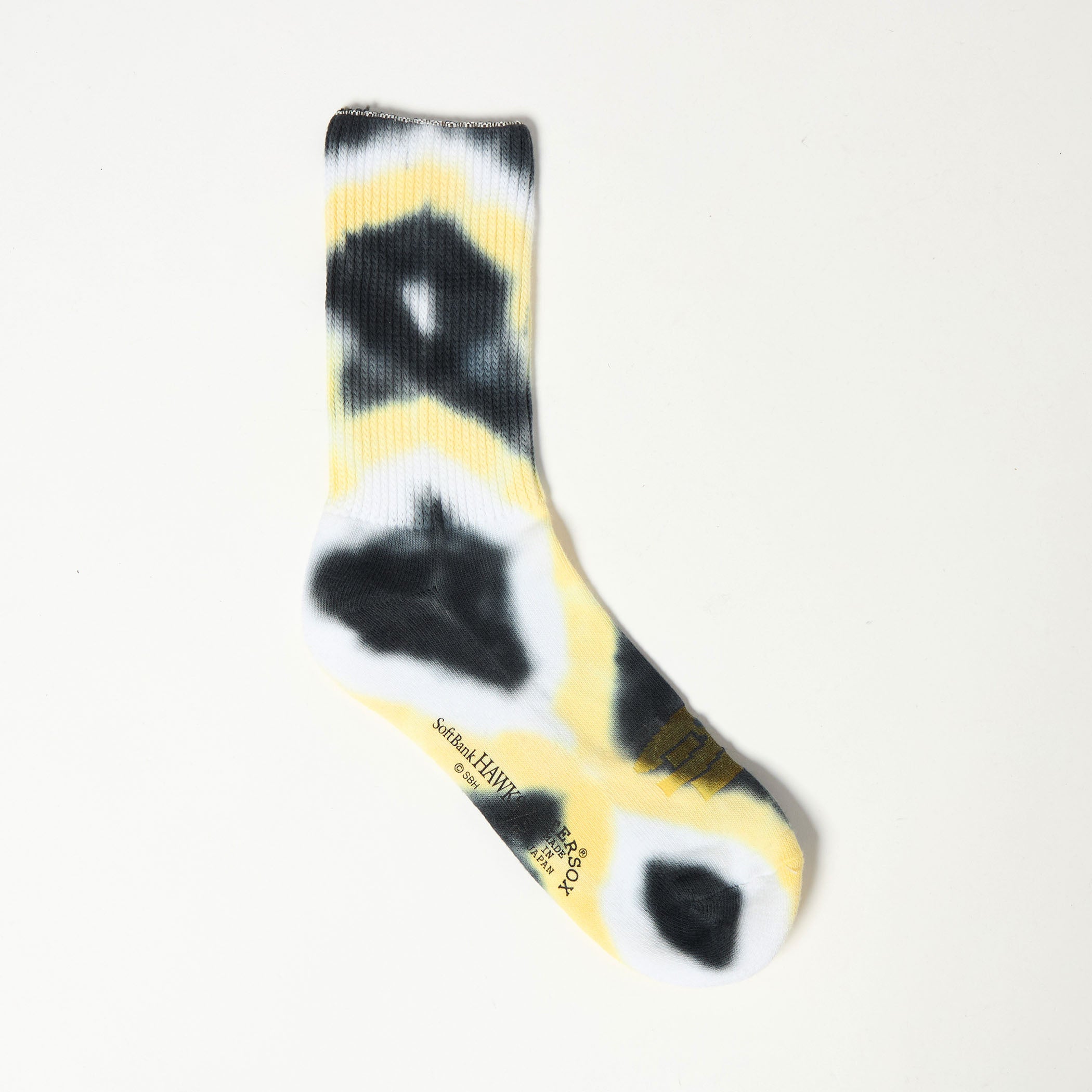 野球用語「Roster(1軍登録)」に由来するソックスブランド「ROSTER SOX」のボディをベースに、ホークスのチームカラーを想起させるペイントデザインをジャガード縫込みで表現しました。足元からホークスらしさを楽しめる一足です。