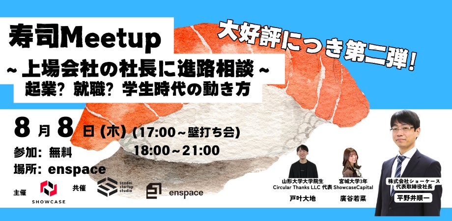企業と顧客をつなぐDXクラウドサービスを展開する株式会社ショーケース(東京都港区、代表取締役社長:平野井順一、証券コード:3909、以下ショーケース)は、東北の学生向け進路相談イベント「寿司MeetUp~上場企業の社長に進路相談~」を、8/8(木)18:00~仙台市にて開催いたします。