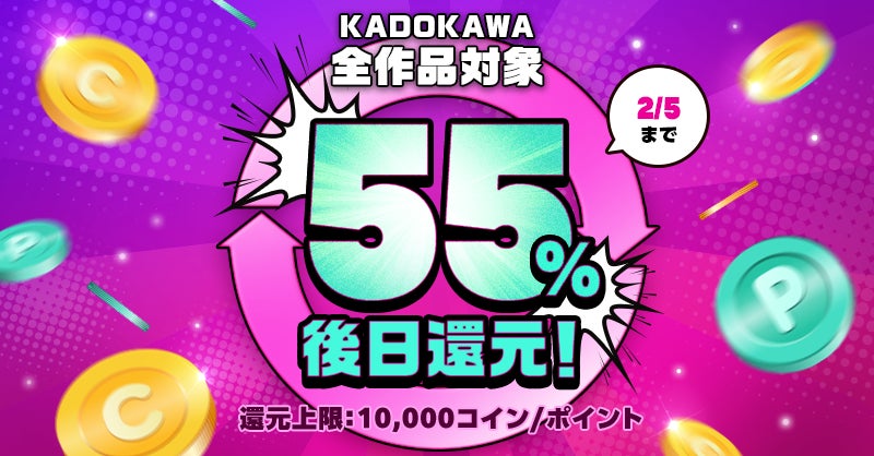 2/4(土)〜2/5(日)2日間限定!ピッコマで配信中のKADOKAWA全作品対象に購入金額の55%相当を還元!