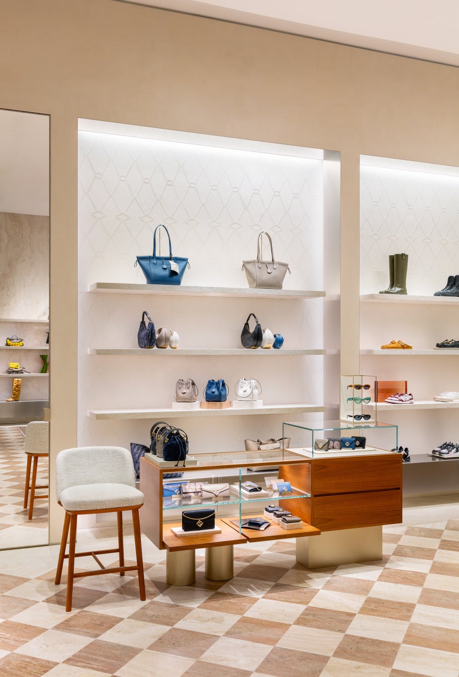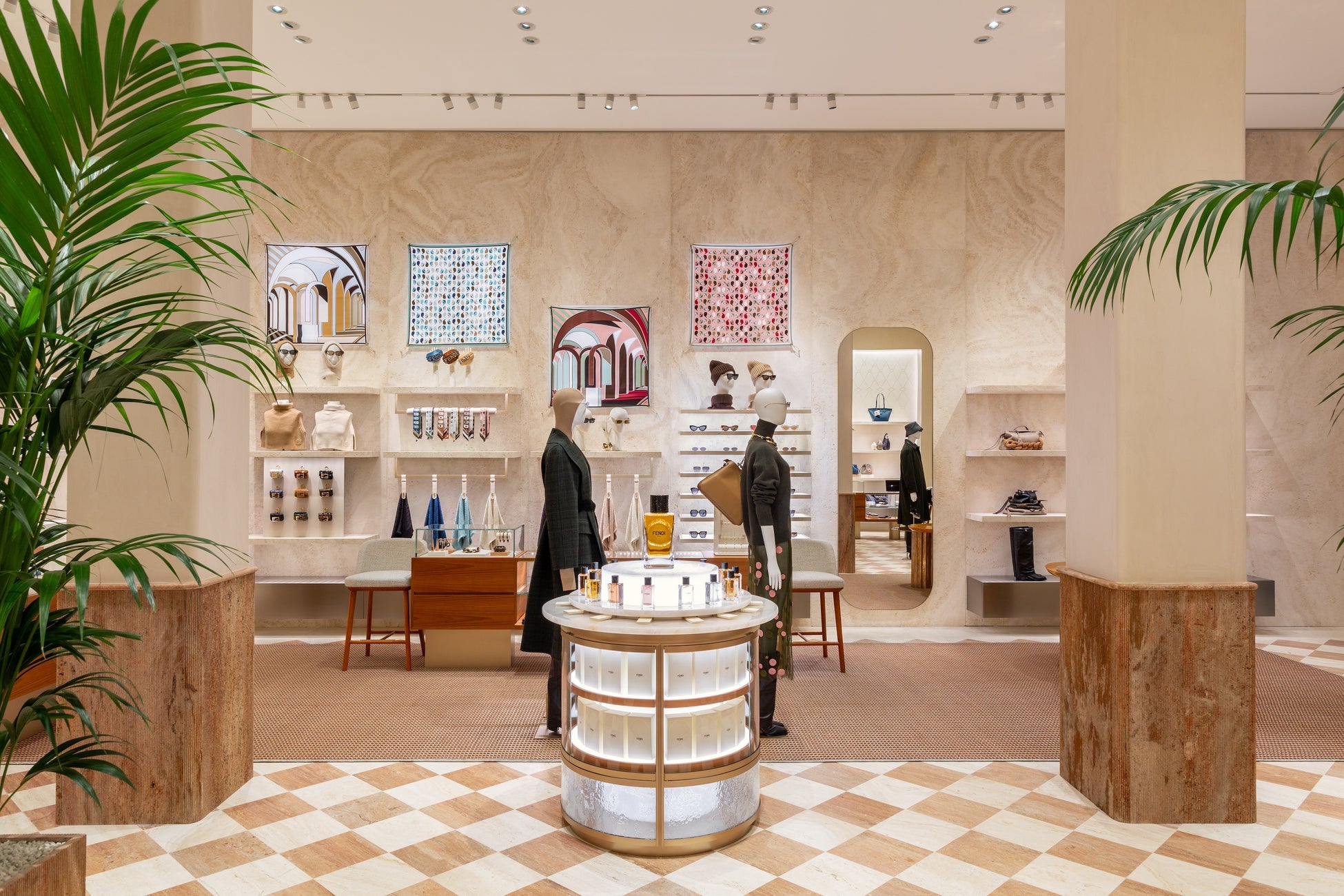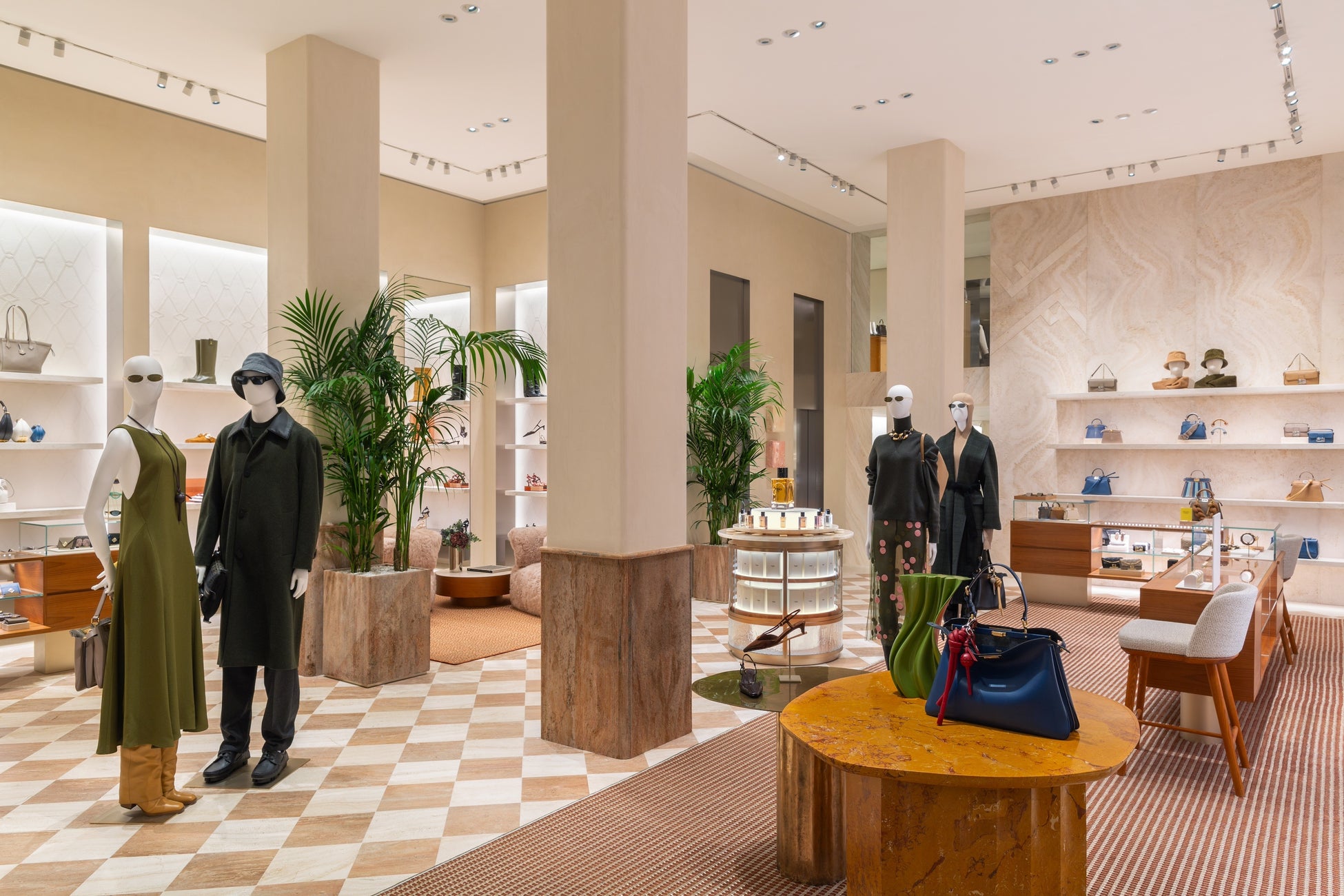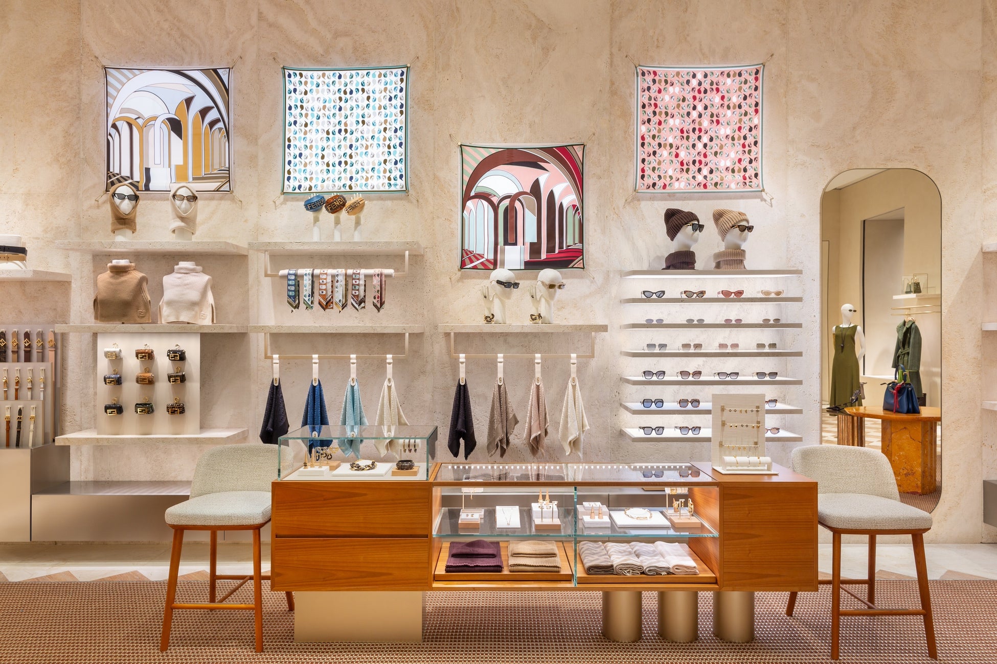 入り口付近はウィメンズバッグ、アクセサリー、シューズのエリアが展開され、壁面には遺跡を思わせるリブ状のトラバーチン大理石が「FF」ロゴパターンで装飾され、メゾンのアーカイブから取り入れた幾何学模様と「ペカン(Pequin)」ストライプが描かれた立体的な石膏装飾を施したニッチが印象的な空間を演出しています。