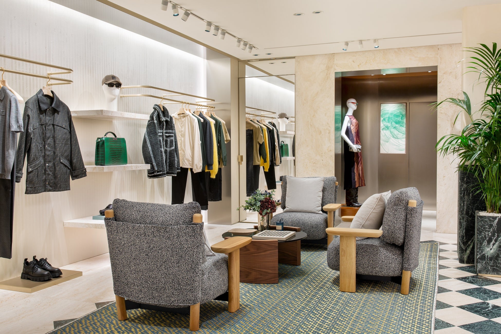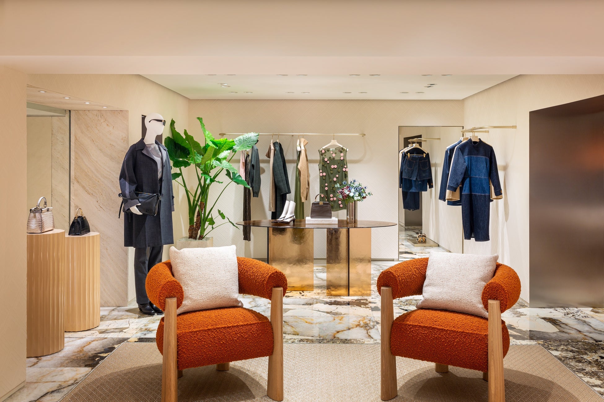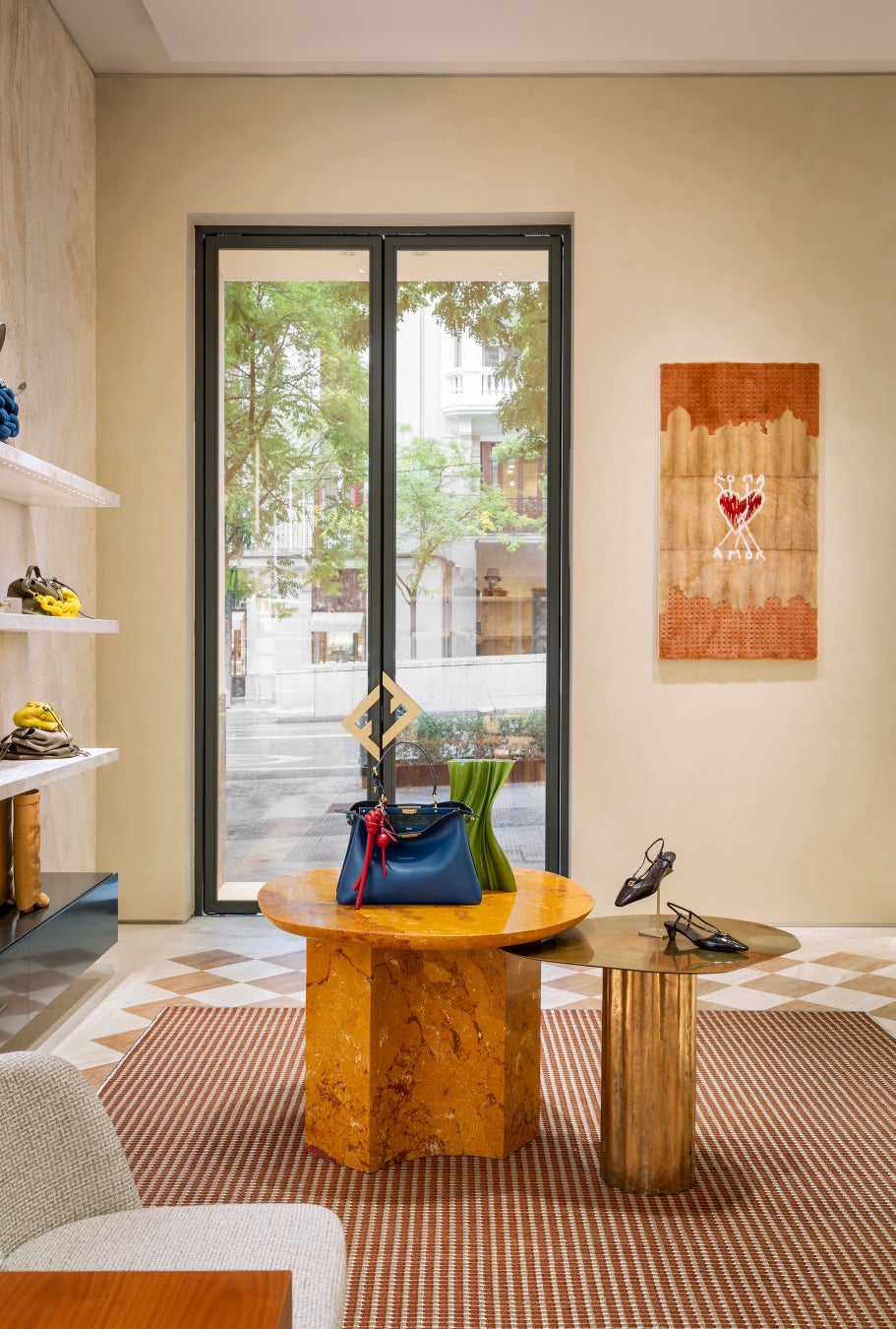 総面積240平方メートルを誇るブティックは、フェンディの世界観を体現する開放的な空間として設計されており、ウィメンズおよびメンズコレクションを幅広く展開しています。メゾンの伝統とコード、スペインの要素、洗練された芸術的な家具、そして厳選された素材が組み合わさり、個性的な空間を創り出しています。