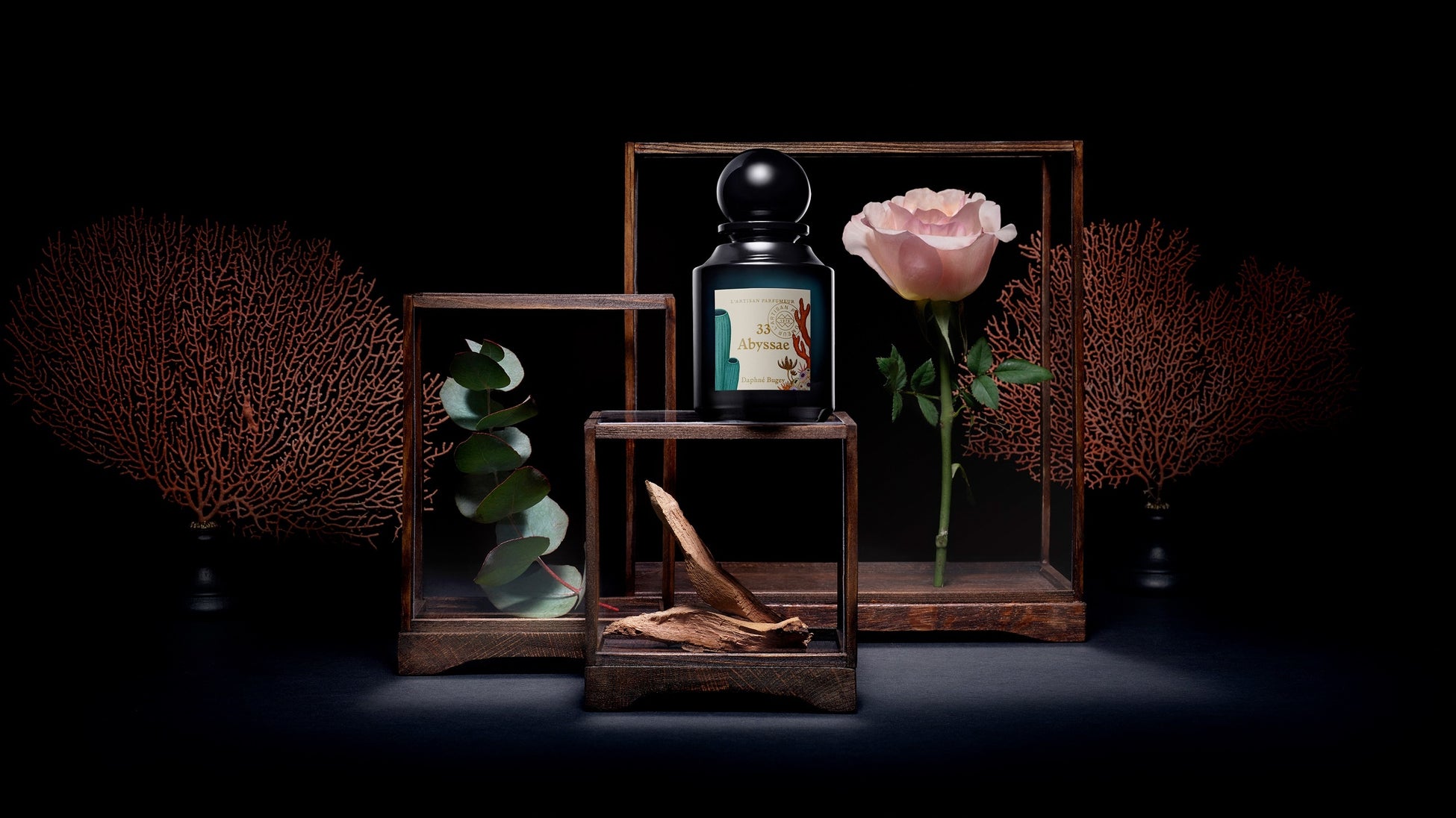 新作では深海からインスピレーションを得て、その深淵を探っています。アンティークな薬瓶を思わせる漆黒のフレグランスボトルとボックスに描かれたのは、海底に広がる神秘的な楽園。海藻とサンゴの色彩が明暗のコントラストを奏で、大海原の果てしない広がりを感じさせます。また、ラベルとボックスには、香りの試作回数である「33」という数字を記しています。