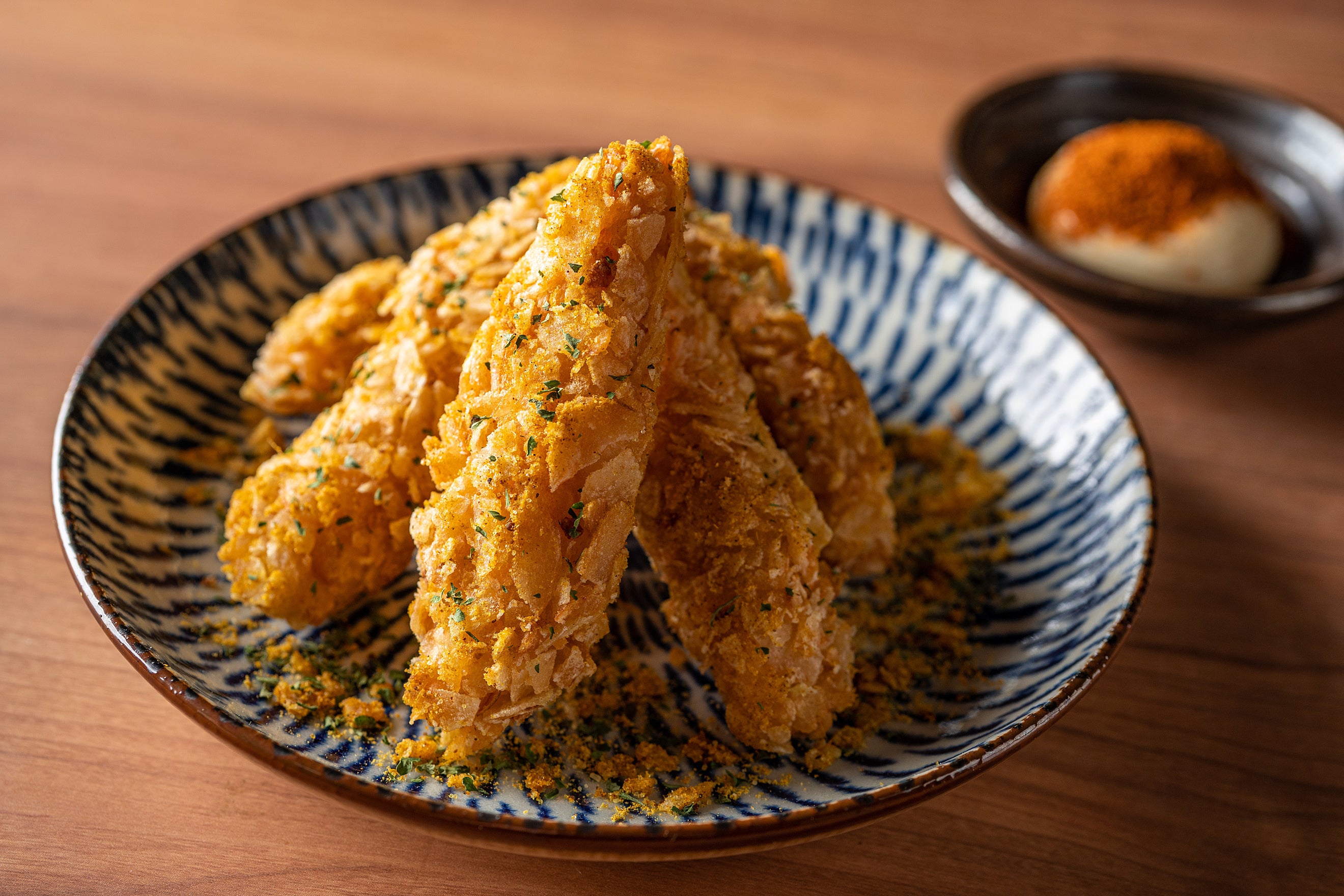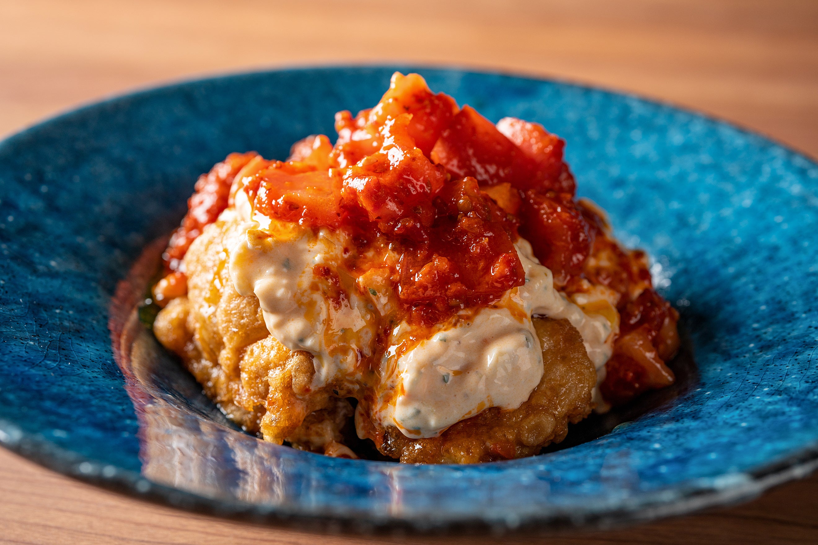 ハム化加工を施したささみは、そのイメージを覆すしっとり柔らか仕上げで、クリスピーな衣との対比も相まって、伸びる手が止まりません。チリパウダーやガーリック、クミンやオレガノなど、豊かな香味が鼻を抜けるケイジャンスパイスを効かせたマヨネーズをつけて召し上がってください。
