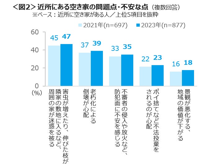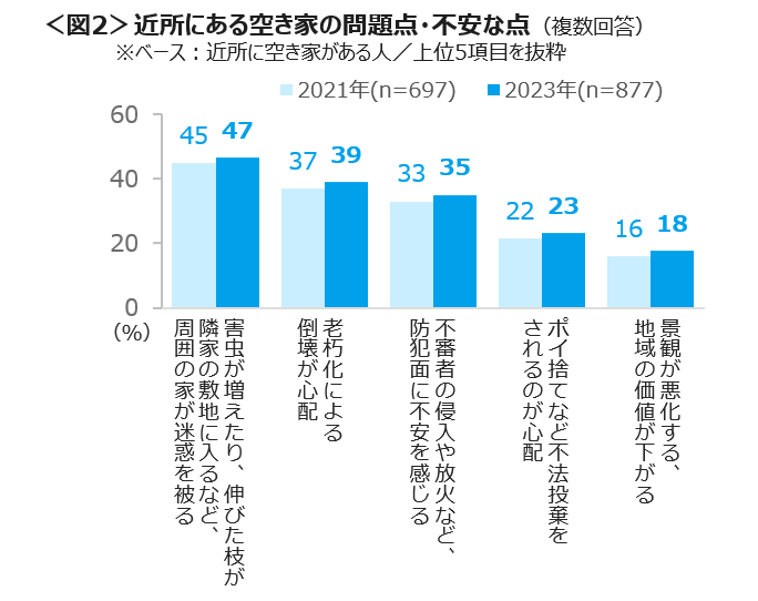 近所の空き家に対し、「害虫が増えたり、伸びた枝が隣家の敷地に入るなど、周囲の家が迷惑を被る」47%、「老朽化による倒壊が心配」39%、「不審者の侵入や放火による火災など、防犯面に不安を感じる」35%などの不安が高い。<図2>2021年と比べ、近所の空き家率や空き家に対する問題点・不安な点に大きな変化は見られない。