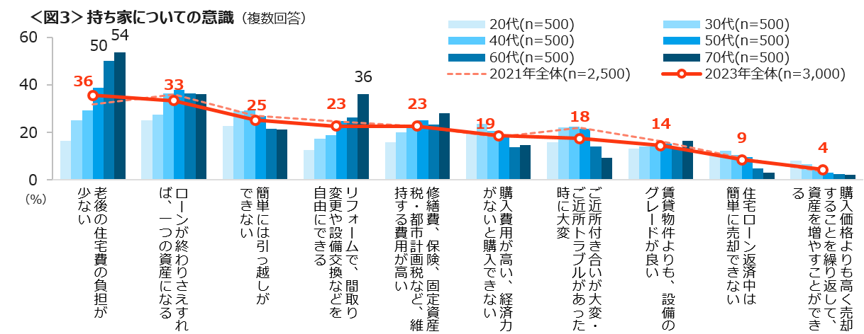 持ち家についての意識・イメージは、「老後の住宅費の負担が少ない」「ローンが終わりさえすれば、一の資産になる」が30%台。特に60~70代の「老後の住宅費の負担が少ない」、70代の「リフォームで、間取り変更や設備交換などを自由にできる」が高い。<図3>