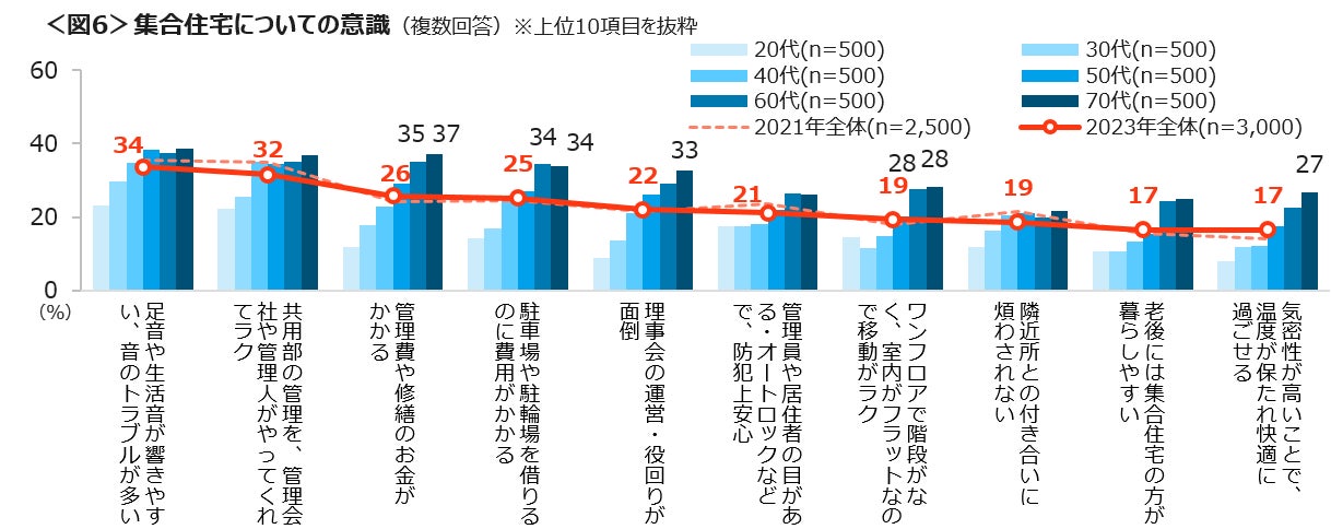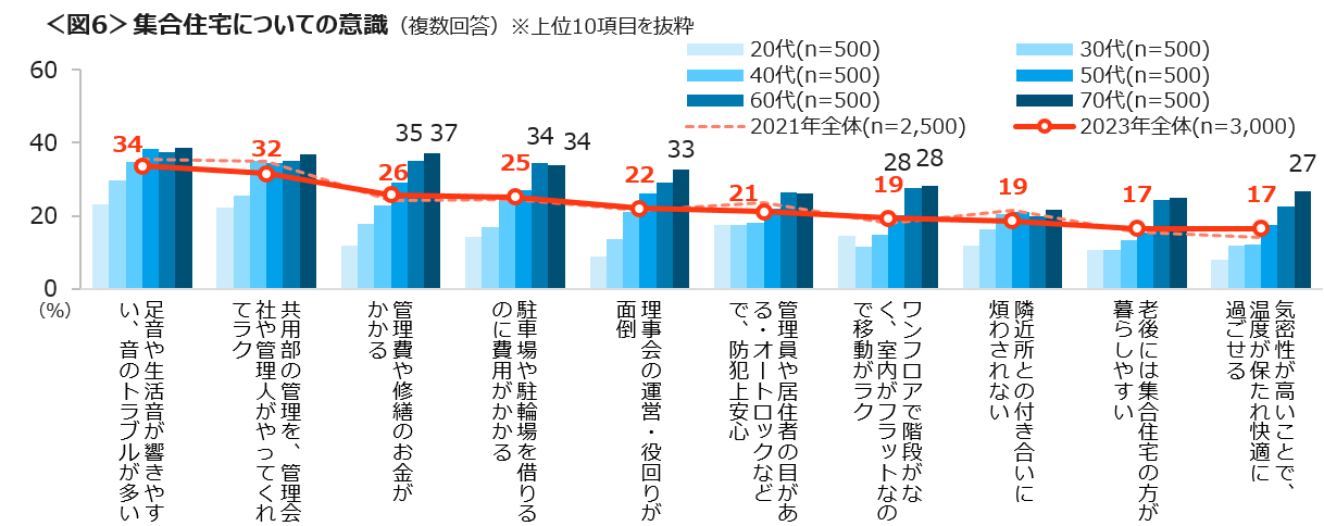 集合住宅は、「足音や生活音が響きやすい、音のトラブルが多い」「共有部の管理を、管理会社や管理人がやってくれてラク」が30%台であった。”音”では、戸建ての方が不安はないと捉えられている。<図6>
