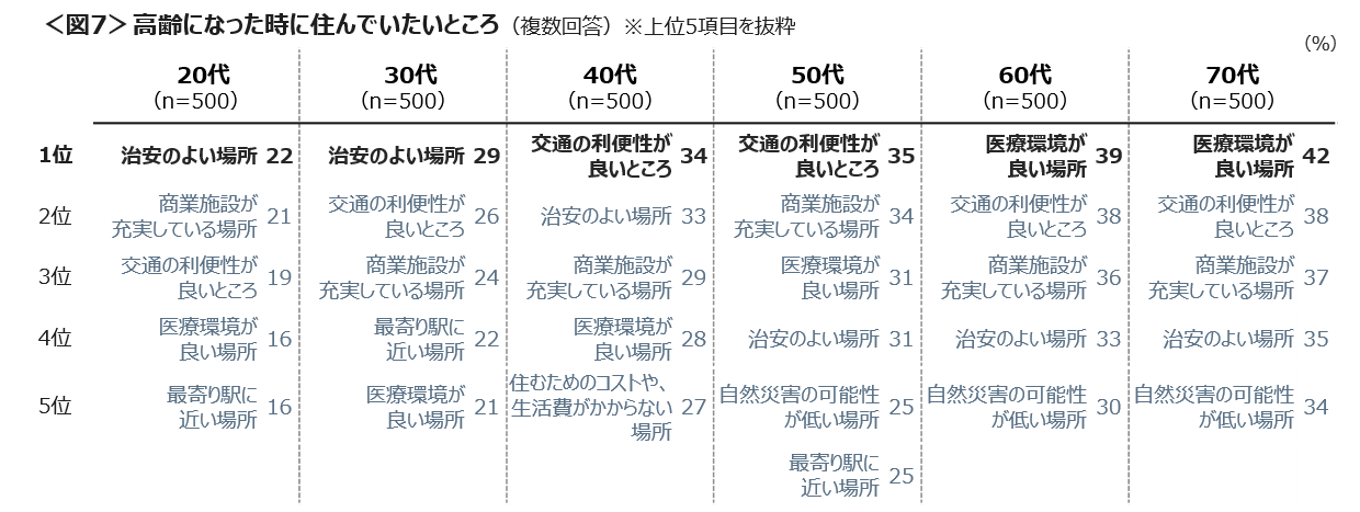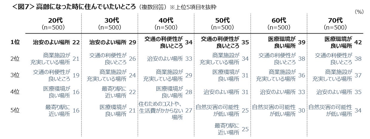 自身が高齢となった時に住んでいたいところでは、20~30代は「治安のよい場所」、40~50代は「交通の利便性が良いところ」、60~70代は「医療環境が良いところ」がTOPにあがり、年代による差が見られた。<図7>