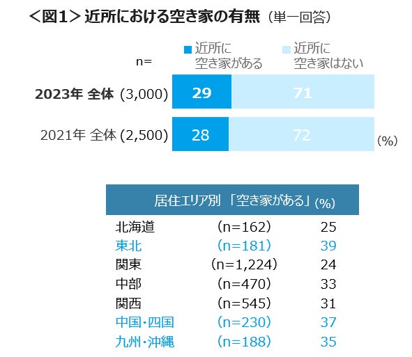 「自宅近くに空き家がある」と回答した人は全体で29%。エリア別には、東北(39%)中国・四国(37%)九州・沖縄(35%)での空き家率が高い。<図1>