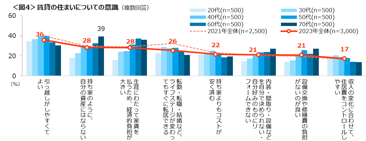 賃貸については「引っ越しがしやすくてよい」が36%。70代は「持ち家のように、自分の資産にはならない」が39%と高い。70代は、”家は資産”という考え方が根強くあると思われる。<図4>