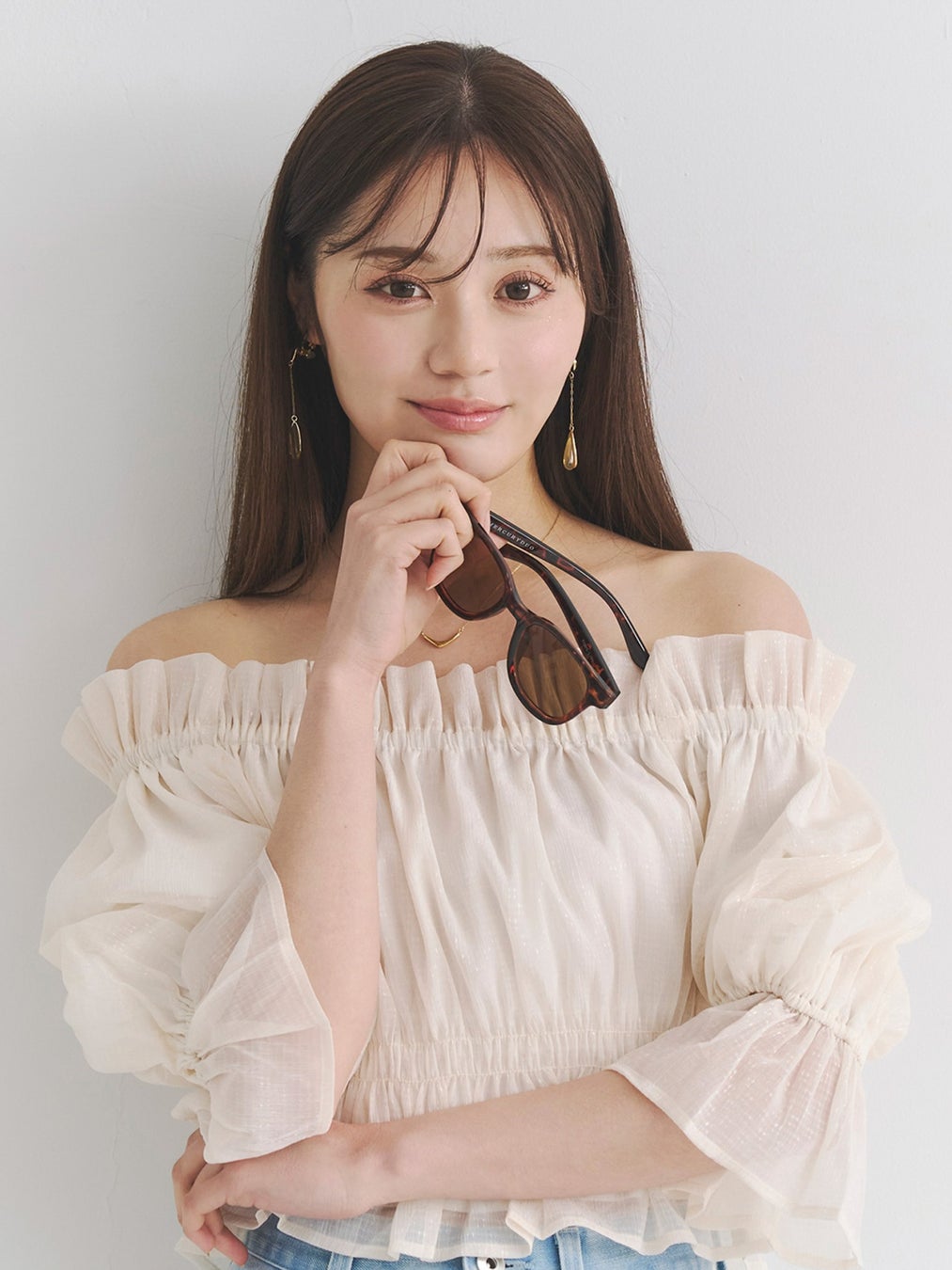 頬にかかる絶妙なサイズ感のフレームが、顔まわりを華やかに演出します。