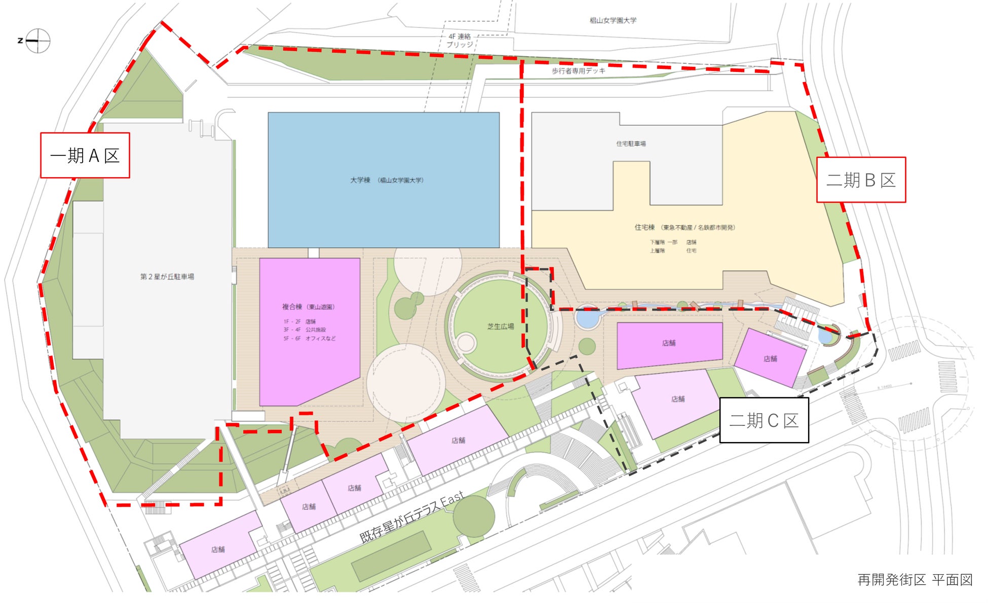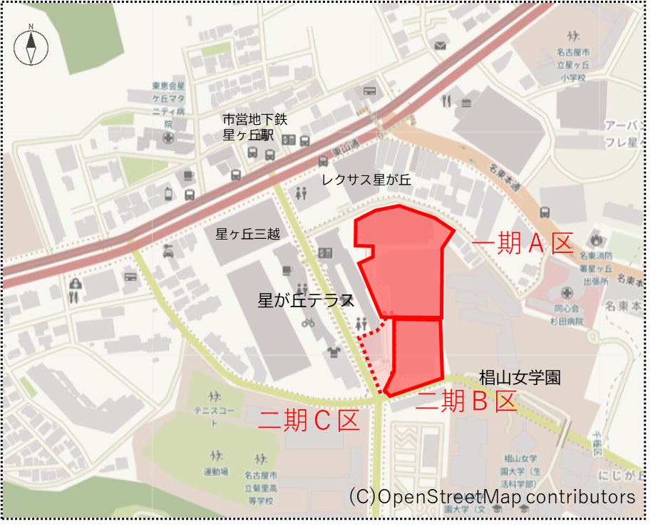 東山遊園が主導する本プロジェクトでは、一期工区として東山遊園による「星が丘テラス」の増床を含めた複合ビルの開発や、学校法人椙山女学園(所在地:愛知県名古屋市、理事長:椙山 泰生、以下「椙山女学園」)による大学施設の新設、そして二事業者共同で街に開かれた歩行者動線や広場の一部が整備され、続く二期工区として、東急不動産・名鉄都市開発が定期借地権付分譲マンション「(仮称)名古屋市千種区星が丘元町計画」(以下「本事業」)を開発いたします。