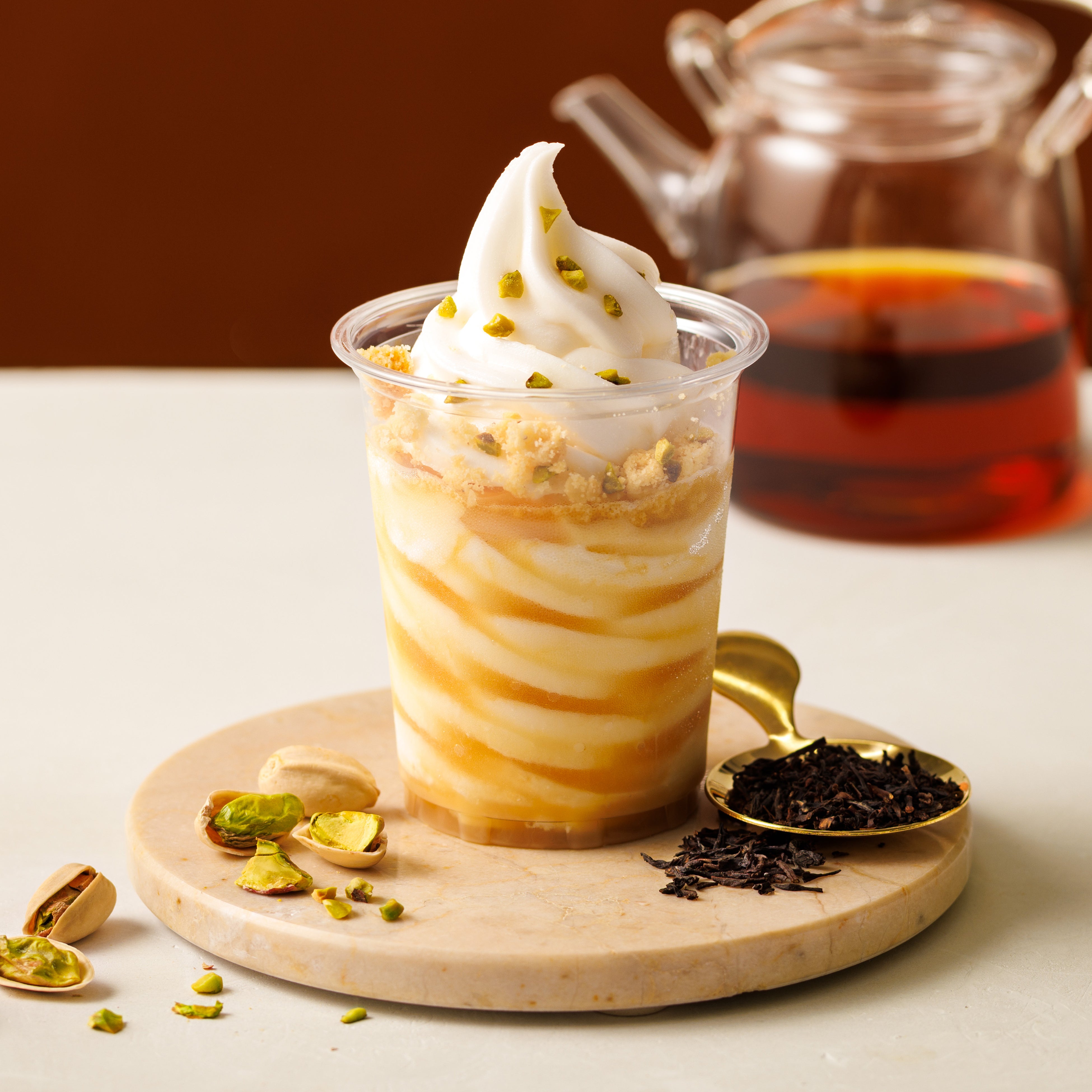 ミルキーなソフトクリームに、香り高いアールグレイを合わせたオリジナルシェイクです。トッピングのバタークッキー・ローストピスタチオと一緒に混ぜながらお楽しみください。上品に広がる香りとともに、クッキーのサクッとした食感、ピスタチオのコクが調和し、ひと口ごとに新しい美味しさに出会える一品です。