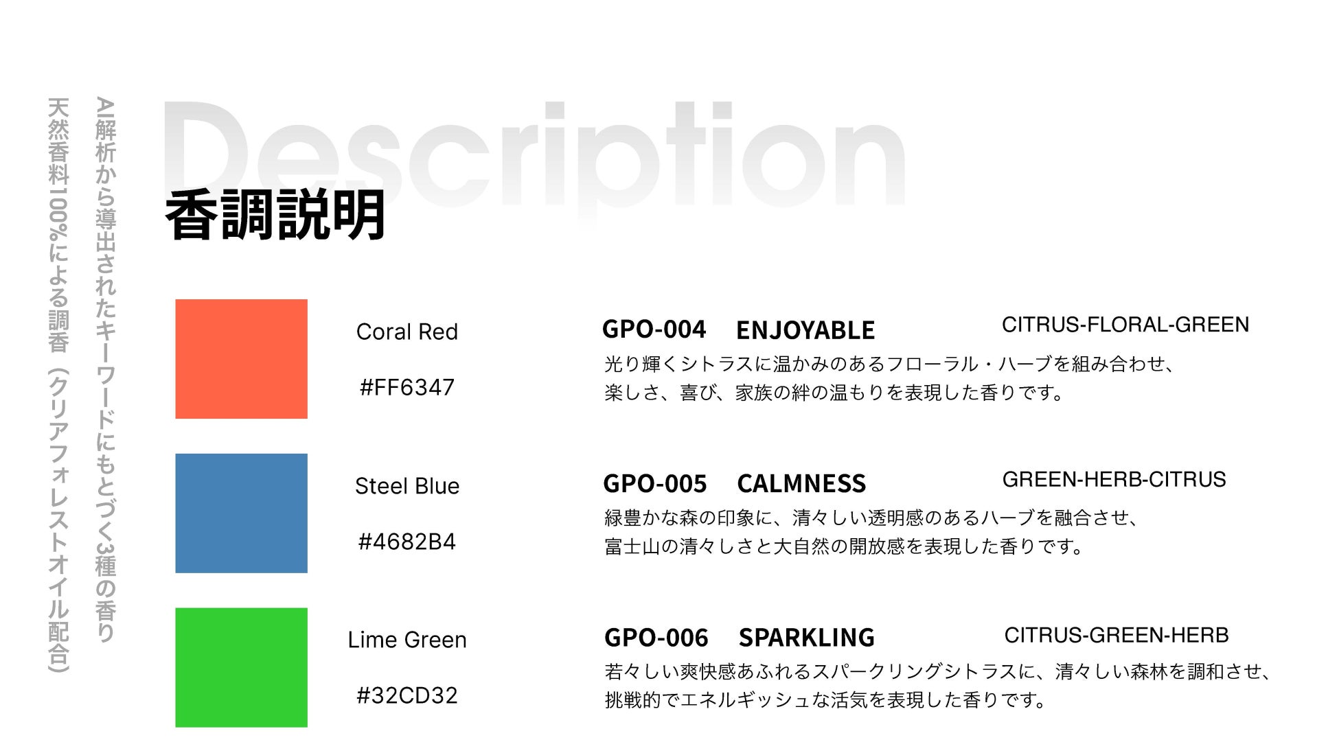 ①「Fresh and Natural」(新鮮で清々しい印象の、自然を想起させる香調)、②「Forest Green」(豊かな緑を感じられる森林浴イメージの香調)、③「Bright Citrus」(明るく輝かしいイメージを持つ柑橘系の香調)