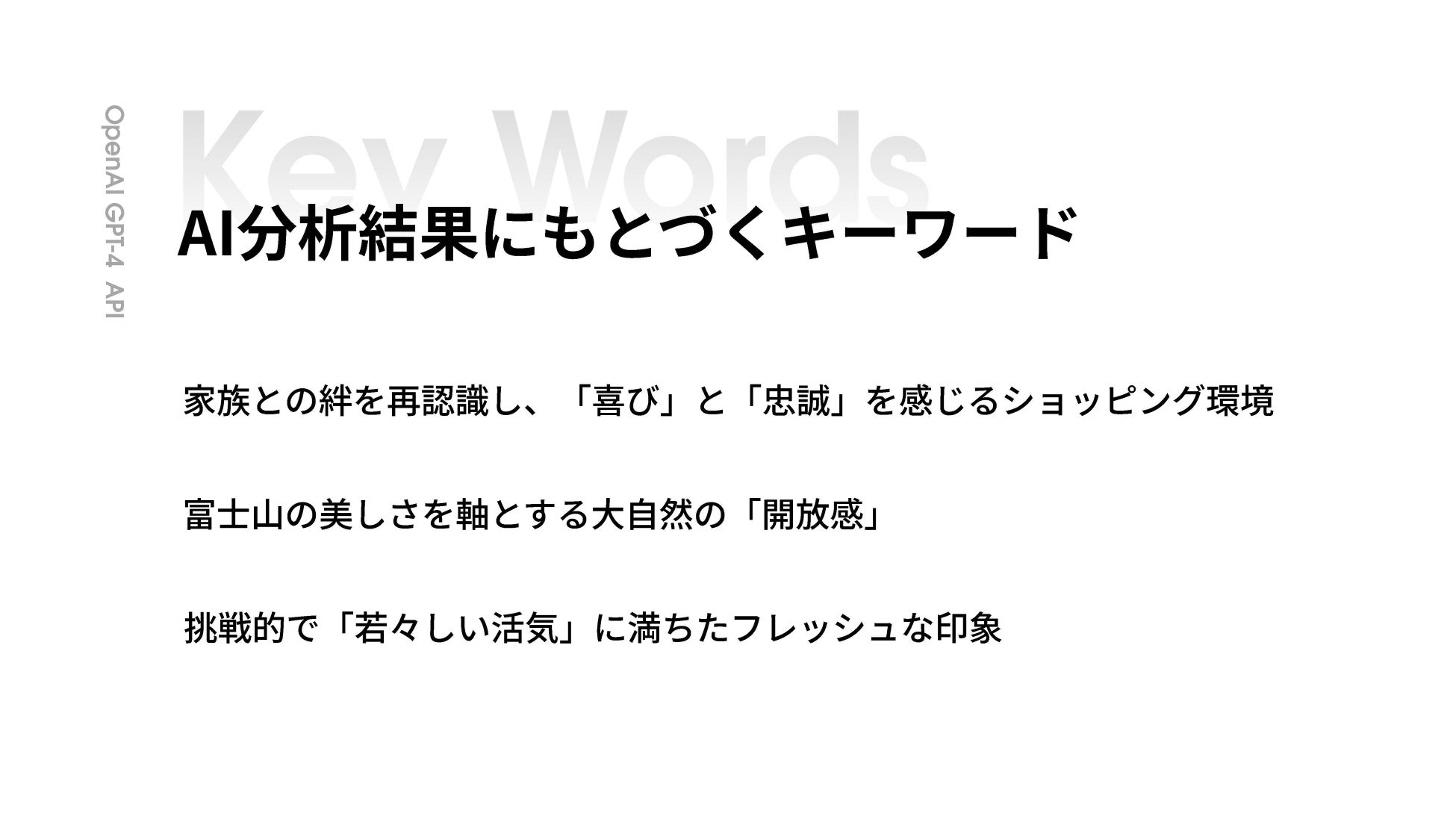 それらをAI解析して生成したキーワード・カラー・画像イメージから、コードミー独自の香り情報に基づいて「御殿場プレミアム・アウトレット」における香調表現を3つ生成。