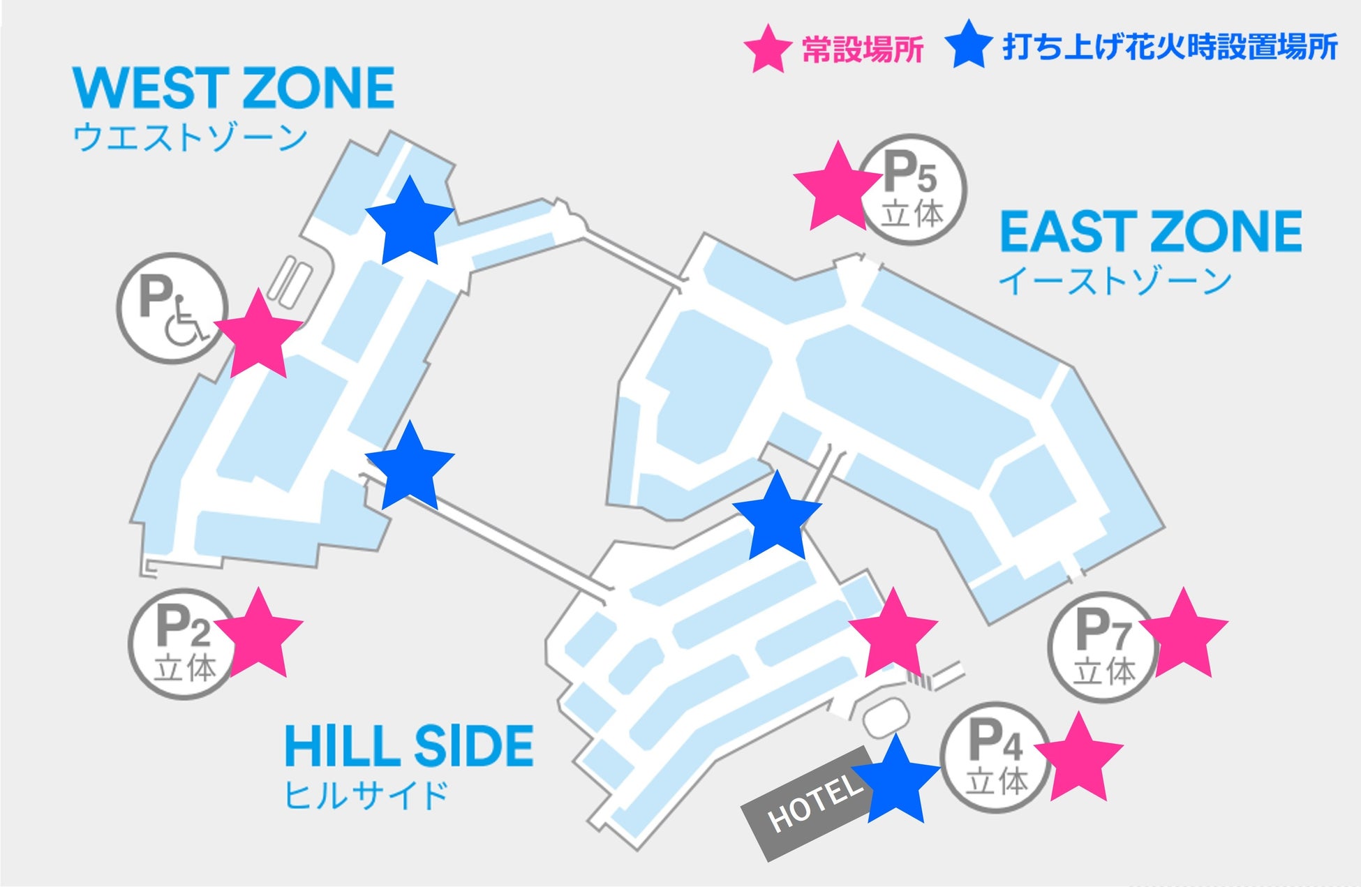 ・アウトレット内:3か所(WEST ZONE Gap前広場、EAST ZONEオハナテラス、希望の大橋)