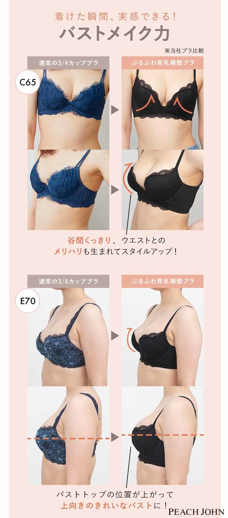 ※PEACH JOHNの育乳補整とは、<バストを支える土台・バスト周りのお肉を面で集めるバストメイク・正しい着用>の3つの着用補整によるバストメイクです。