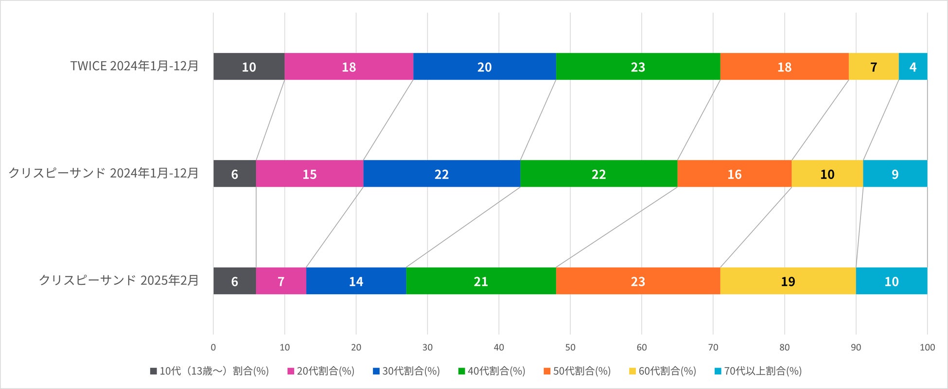 年代別の割合では、TWICEに関しては若年層からの検索が若干多いものの、2024年1年間の「TWICE」と「クリスピーサンド」の分布は比較的近くなっています。一方で2月の「クリスピーサンド」の検索は、20〜30代の検索割合が大きく減少し、50〜70代の検索が増加しています。ここからテレビの視聴頻度が多い50代以上への影響が強く見られると共に、「TWICE」や「クリスピーサンド」の浸透率が浅いと思われる高齢層にとっては、今回のCMの目新しさが、検索行動に繋がったとも考えられるのではないでしょうか。