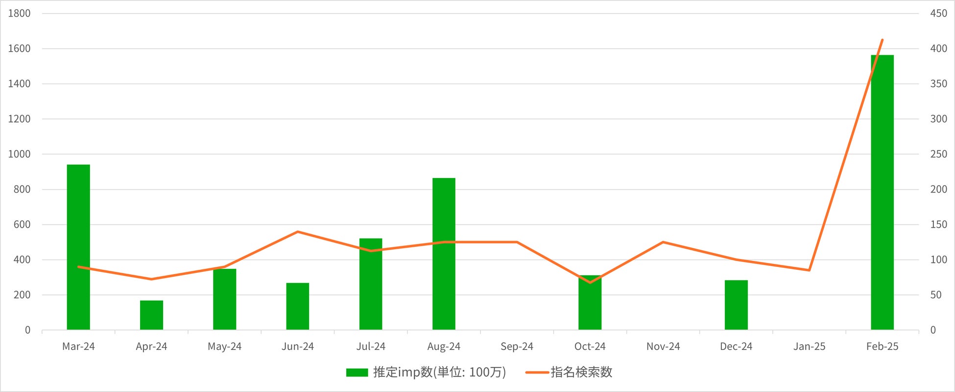 「ハーゲンダッツ」のCM放映量(他商品含む)と「ハーゲンダッツ クリスピーサンド」の検索数の推移を見てみると、2025年2月は放映量自体が多いものの、「クリスピーサンド」の新CMと共に指名検索が一気に上昇した様子がわかります。