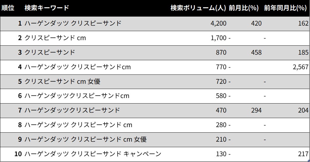 「クリスピーサンド」を検索した人の共起キーワードの上位には、「cm」や「cm 女優」という検索が多く見られ、CMへの注目度が表れています。前月比や前年同月比からも、商品やCMの検索が大きく増加していることがわかります。