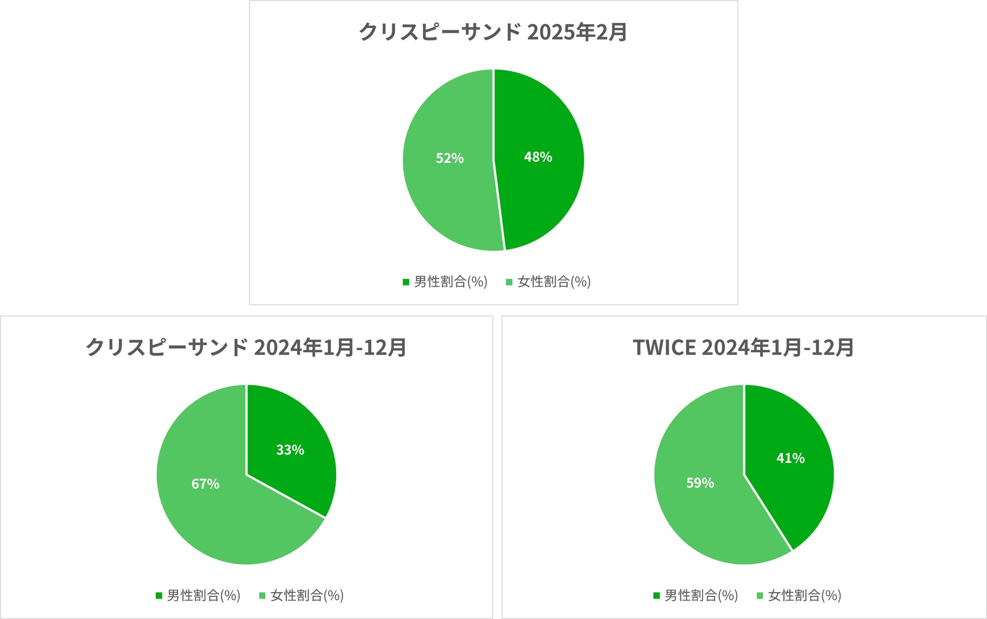 「クリスピーサンド」を検索した人の男女比について、前年1年間のデータを見てみると、男性33%、女性67%と、女性が約3分の2を占めていました。しかし、今年2月の検索では、男性が48%、女性が52%とほぼ半々で、通常時よりも男性の検索割合が高くなっていることが分かります。この割合に関しては、前年1年間に「TWICE」を検索した人の男女比と近い傾向が見られます。