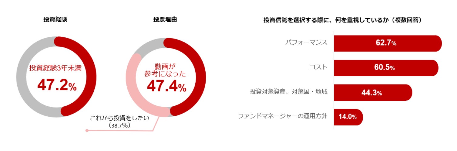 今回の投票では、投資経験3年未満の方が47.2%と、コロナ禍以降に資産形成をはじめた方にも多くご参加いただきました。投資信託を選択する際に重視している点は、「運用成績(パフォーマンス)」が最も多く、次いで「コスト」や「投資対象」となりました。また、新たに掲載した各ノミネートファンドの運用会社オリジナル動画が参考になったとの回答が47.4%となるほか、「知らないファンドを知る機会になった」、「来年からの新NISAを利用する際の参考にしたい」などのお声もいただき、本アワードを次の投資商品選択のための情報収集としてもご活用いただいていることがわかりました。
