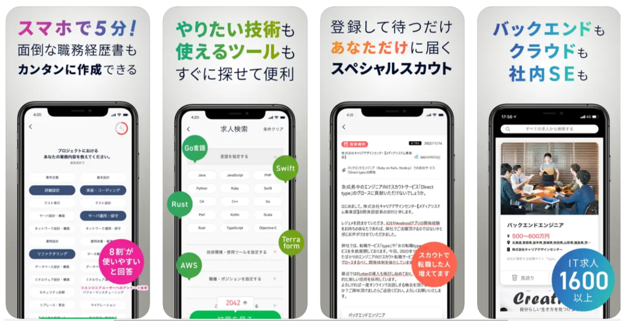 経験やスキル、希望職種などを登録しておくだけで企業から直接アプローチされるため、登録後は待つだけで転職活動を進めることができます。Direct typeの機能はすべてエンジニアナイズされており、職種から言語、使用技術とエンジニア向けの検索項目・登録項目が充実しています。経験や希望条件を詳細に登録することができるため、登録者✕企業の高精度なマッチングが可能です。またiOSアプリでは項目を選んでタップしながら職務経歴書が作成できる簡単作成機能を搭載。多くの転職活動中のエンジニアに活用いただいています。