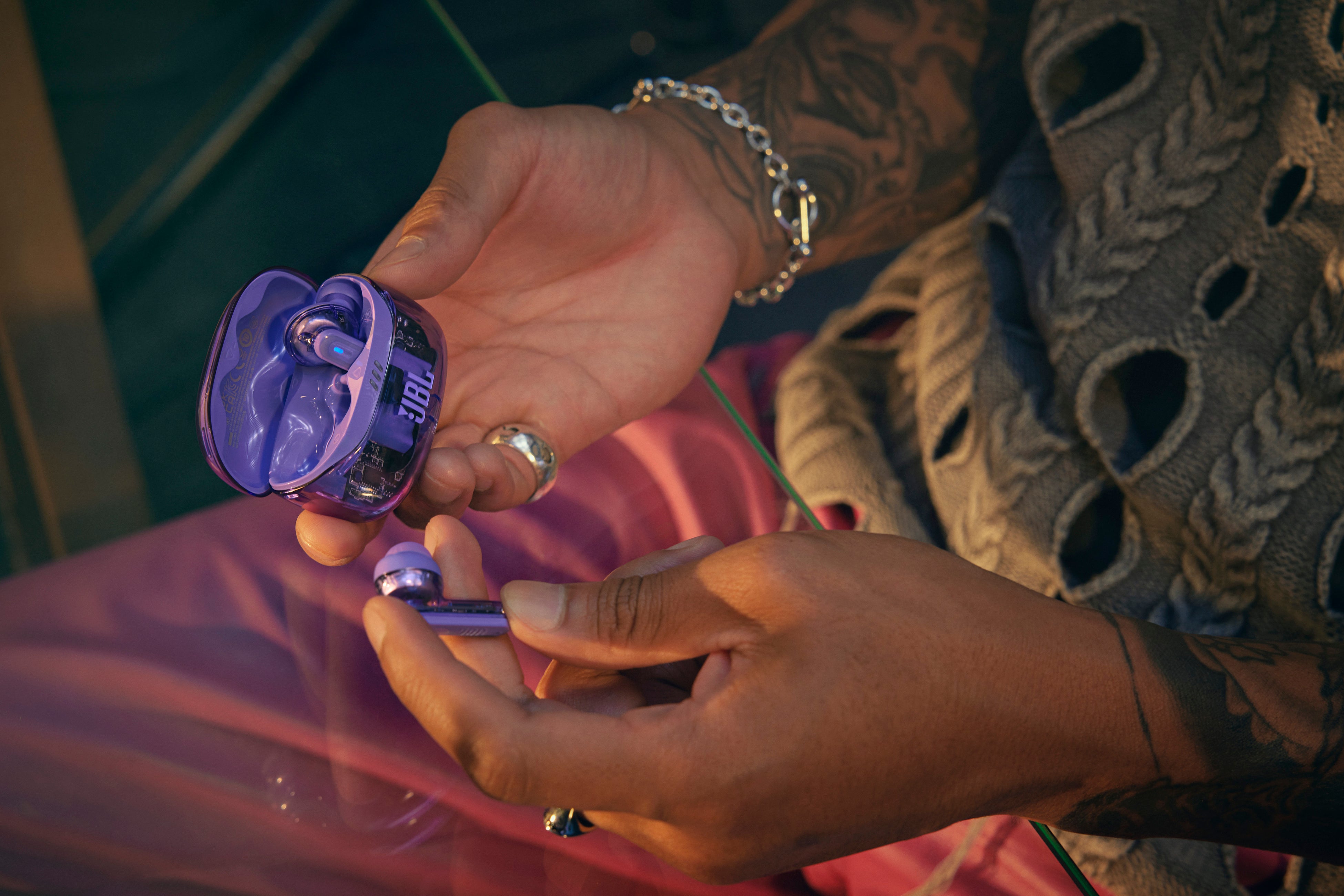 そして、今回発売となる「JBL Tune Beam 2 Ghost」はそのオリジナルモデルに優れた衝撃強度と耐熱性を兼ね備えた航空機グレードのポリカーボネート採用のスケルトンデザインを施したスペシャルモデルとして登場。耐紫外線性が施されているため黄ばみや劣化の心配が極めて低いほか、内部の基盤などが透けて見えることでメカニカルな近未来感をお楽しみいただけます。また、カラーはブラック、ホワイト、モーヴの3色をラインアップ。使用シーンや普段のスタイルに合わせてお選びいただきやすくなりました。