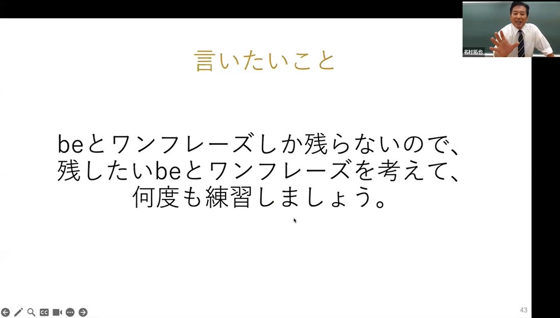 本セミナーでは、「1分で惹きつけるプレゼンの技法」著者 名村拓也氏をお招きし、3日後も記憶に残るウェビナーの創り方・伝え方についてお話しいただきました。プレゼンは「3日後に何を残したいのか?」から逆算して企画していくこと、そして1時間プレゼンをしたとしても視聴者に残るのはプレゼンターの人となりである「be」と「ワンフレーズ」のみであることを念頭に伝えることを熱く語っていただきました。※be=人柄、会社の印象