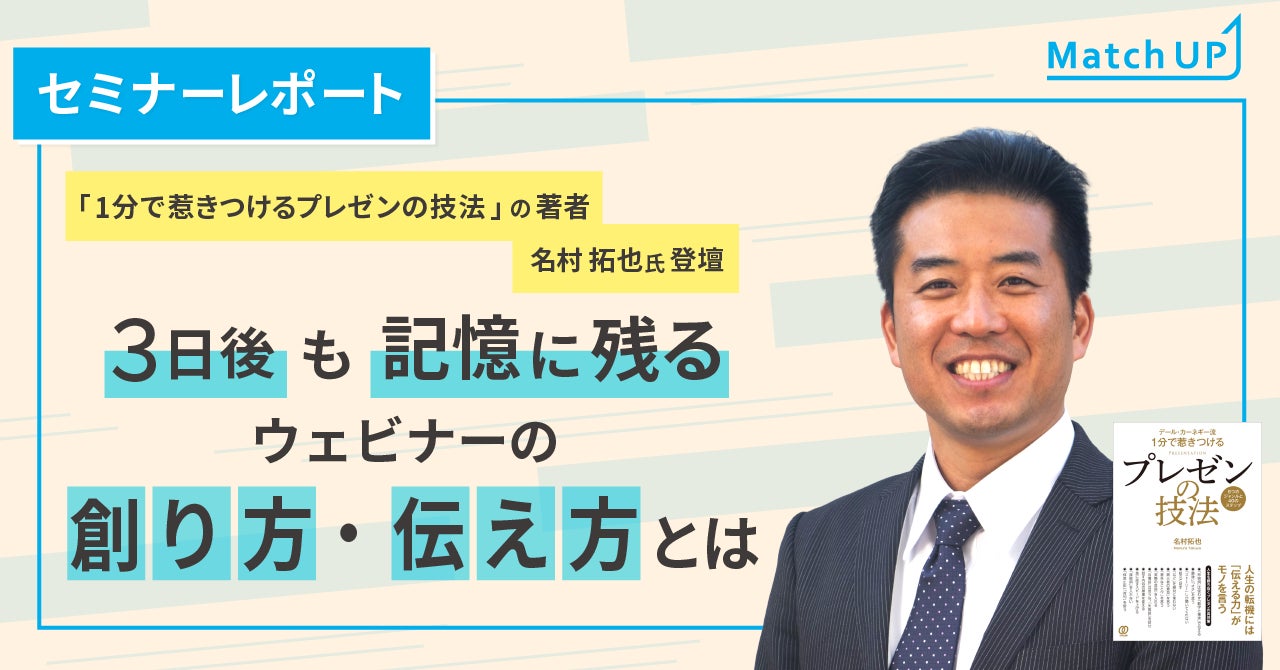 【セミナーレポート】「1分で惹きつけるプレゼンの技法」著者 名村拓也氏にご登壇いただき、「3日後も記憶に残るウェビナーの創り方・伝え方」をテーマにセミナーを開催しました
