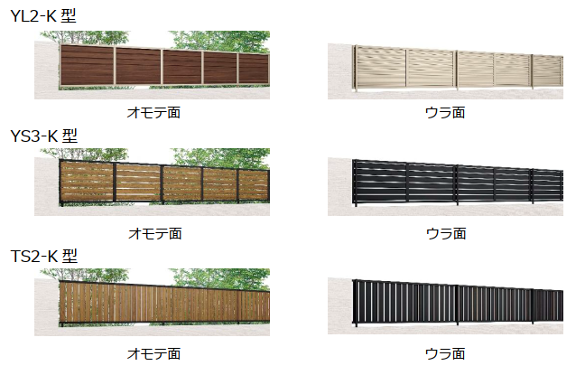 目隠ししながら風が通る構造が特徴の横ルーバーデザインYL2-K型、目隠し率約80%で適度にプライバシーを守りながら、風と光を通す横スリットデザインYS3-K型と縦スリットデザインのTS2-K型の3種類で、片面木調色をお選びいただけます。