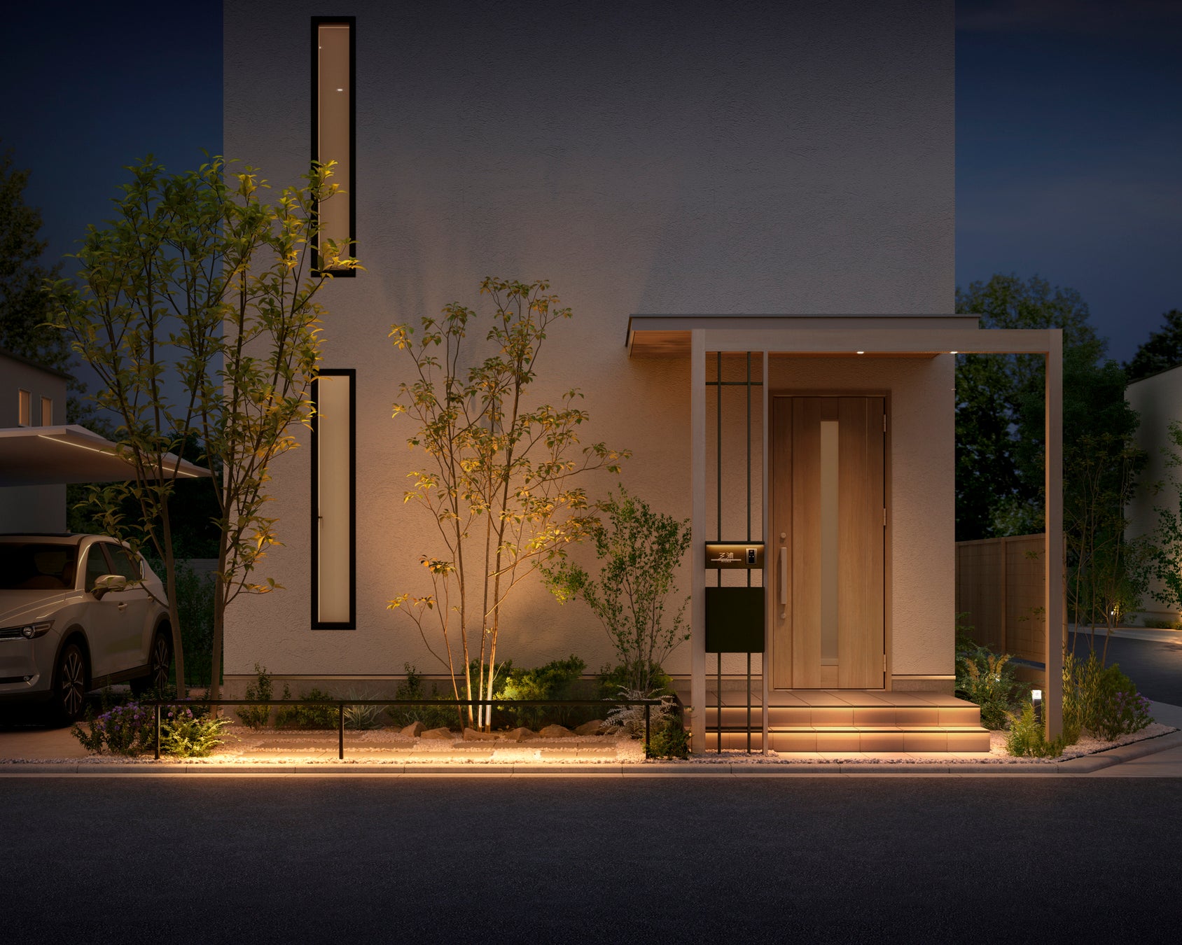 その他にも、日本古来の留め石をモチーフにし外とのつながりをもちつつ、空間をゆるく仕切ることのできる「フェンスAL」に美彩のシームレスラインライトをオプションで追加しました。シームレスラインライトを笠木に内蔵し、真っすぐなラインが美しいライトは、フェンスALのシンプルなデザインに馴染み敷地の境界を昼も夜も、ゆるく仕切ります。