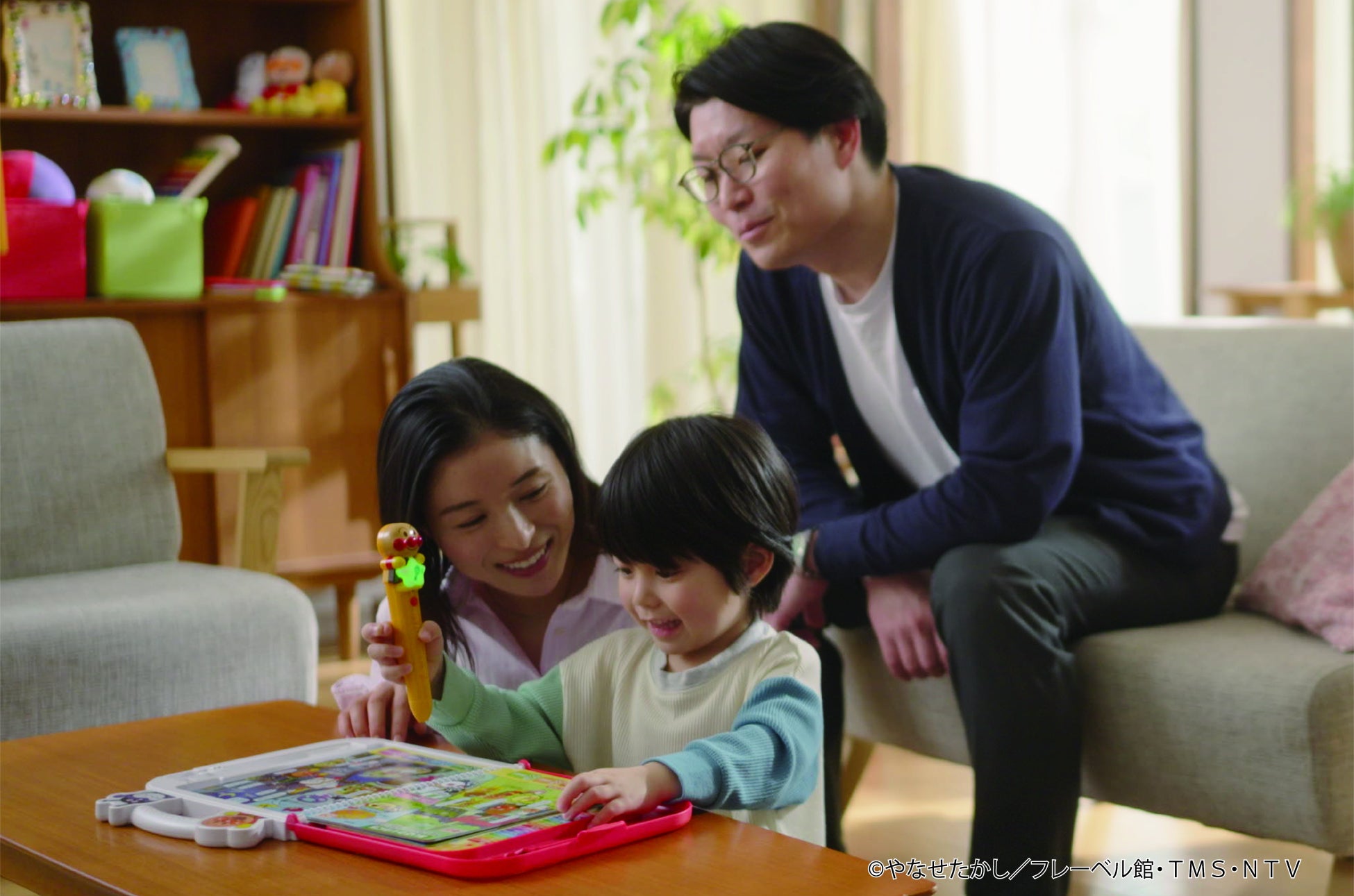 たとえば、「ありがとう」「ごめんなさい」など、日常のあいさつやマナーについて学べるシーンを収録。相手への思いやりや感謝の気持ちを学べるほか、「ジャムおじさん おてつだいします」などのアンパンマンとなかまたちがやり取りをする場面を通じて、お子様が自然と、相手の状況や気持ちを理解する“こころ”も育む構成となっています。他にも、言葉を聞いて学ぶだけではなく、発語も促す機能も搭載し、お子さまの言葉の成長によって親子のコミュニケーションをより深め、数多くのご家庭から好評の声を頂いています。