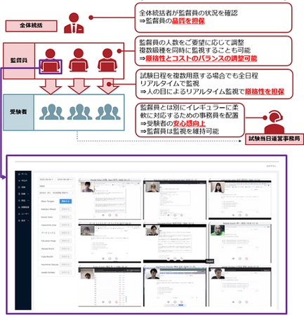 全体統括者、監督員、運営事務局の3者体制で試験を実施。監督員がリアルタイムに受験者を監視し、また、全体統括者による品質維持、運営事務局による受験者サポートで安定的な運用を行います。なお、リアルタイム監視には株式会社データミックスの「Excert(エクサート)」システムを利用しています。