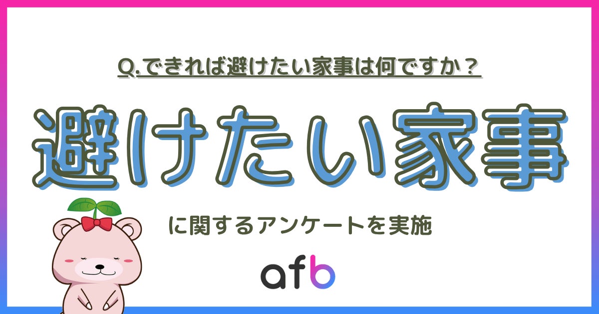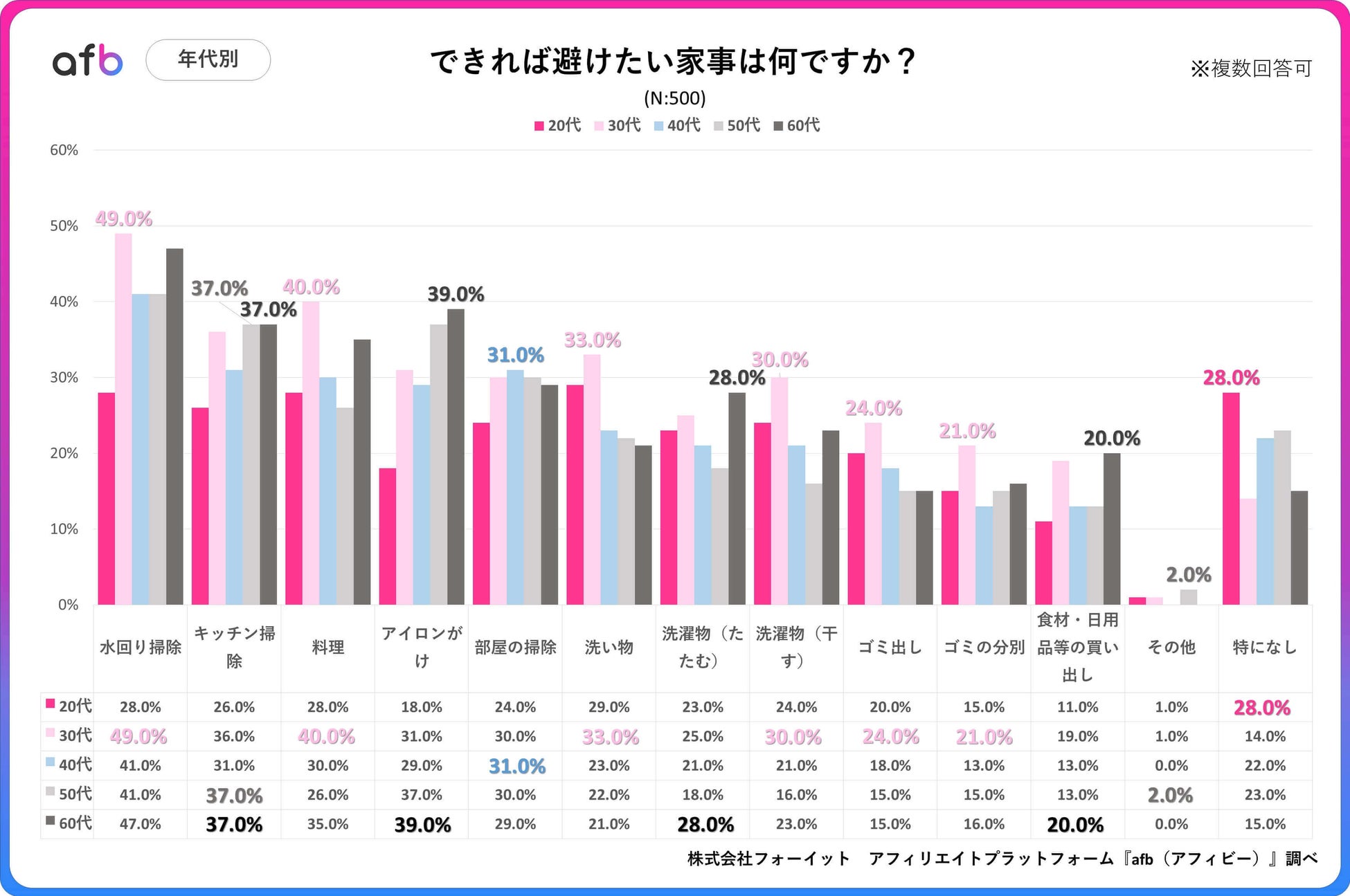 アフィリエイトプラットフォーム「afb(アフィビー)」< https://www.afi-b.com/ >の開発運用をおこなう株式会社フォーイットは、全国の20代~60代までの男女500人を対象に家事に関するアンケートを実施し、年代別等の特徴についてまとめました。