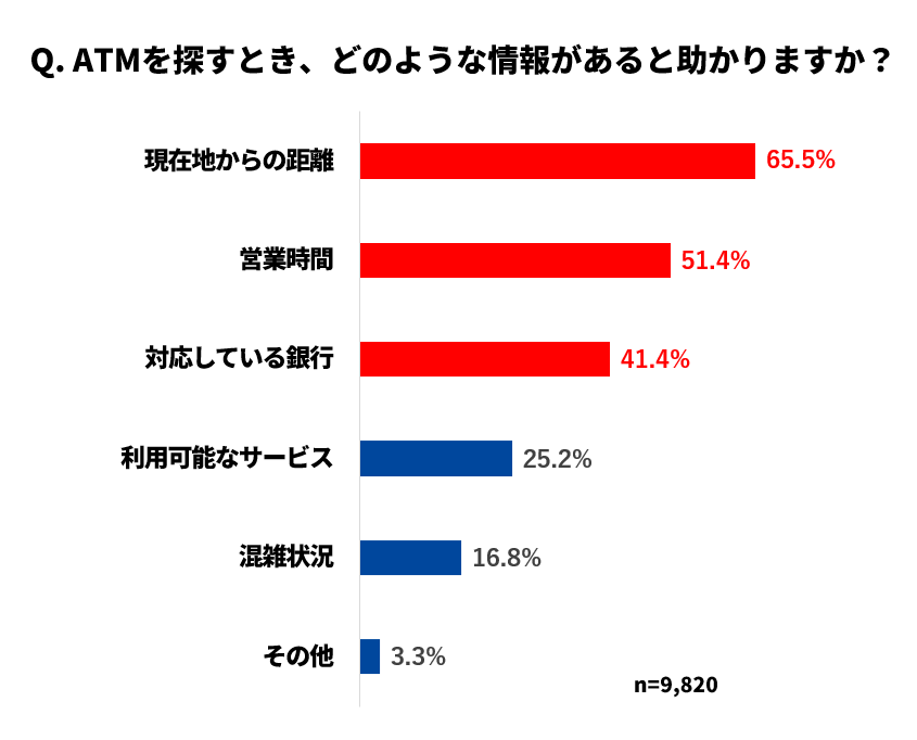 事前検索は買いもの以外の社会インフラまで。ATM検索で気になるのは「現在地からの距離」が6割超え