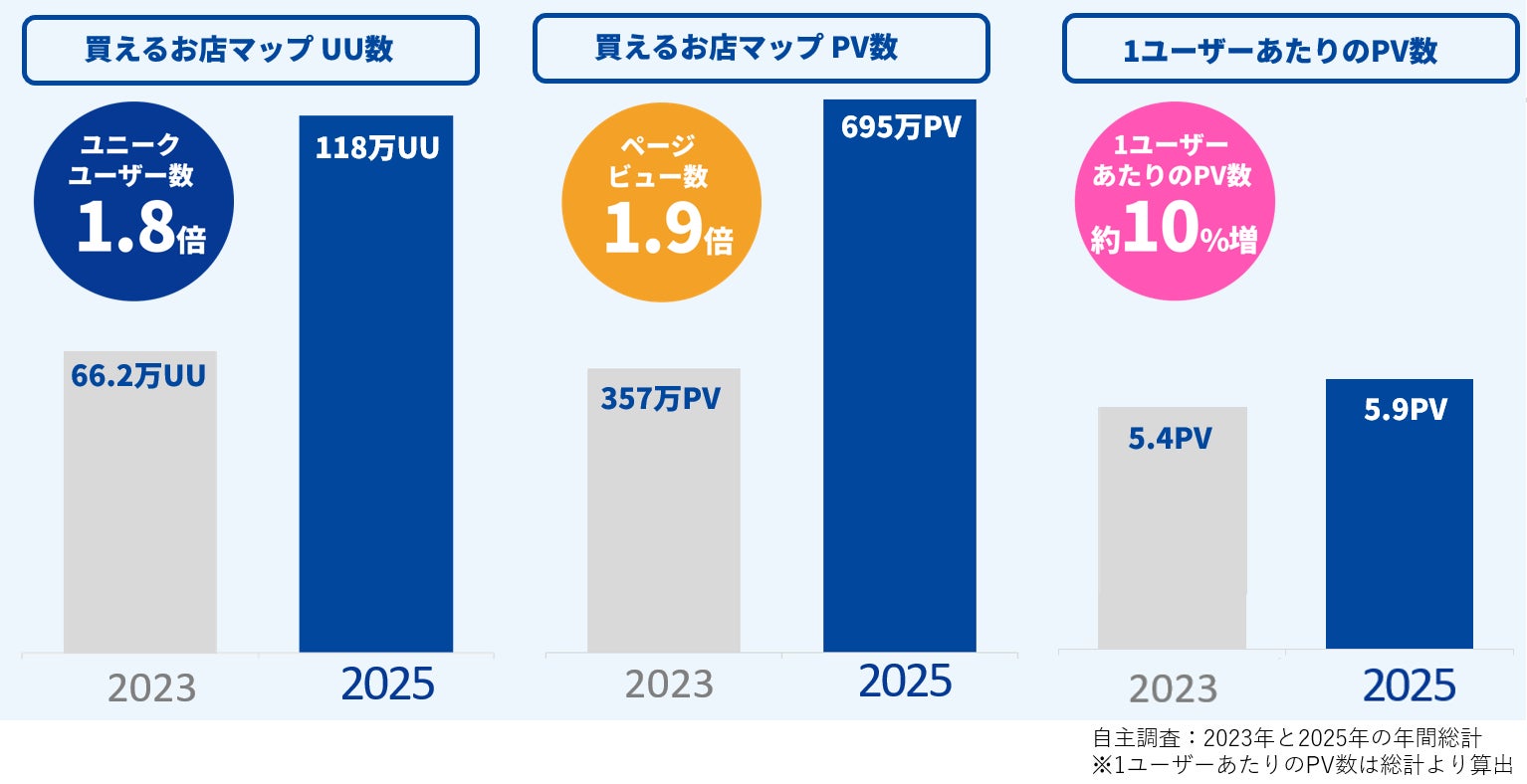 当社が運営する「買えるお店マップ」の直近の利用状況を調査した結果、購買前の店舗検索行動が大幅に増加していることが明らかになりました。2023年から2025年にかけて、UU(ユニークユーザー)数は約1.8倍、PV(ページビュー)数は約1.9倍に増加しました。また、1ユーザーあたりのPV数も5.4から5.9へと約10%増加しており、利用者数の拡大だけでなく、一人ひとりがより多くの商品情報を比較検討していることが明らかになりました。これは、「確実に買える店舗を事前に調べる」という、計画的な購買行動が消費者の間で一般化している傾向を示しています。