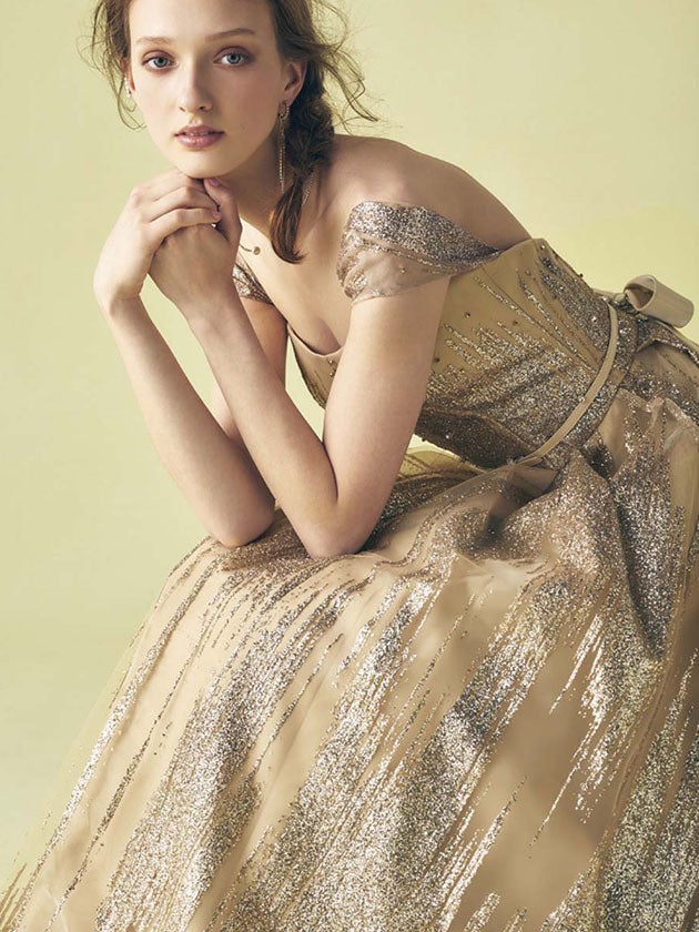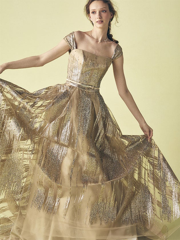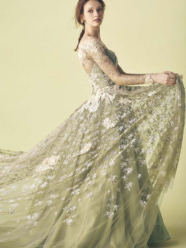 ANTEPRIMAの代名詞といえるグリッターチュールに、アンティークテイストのレースを重ねのせた人気のテイストを、流行りのくすみカラーで仕上げています。人気のニュアンスグリーンにGold×Silverのグリッターが華やかさに輝きます。長袖のヨークは取り外し可能で、外すと印象をガラッと変える2Wayアレンジが可能なドレスです。