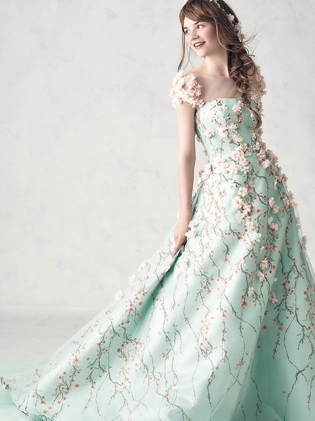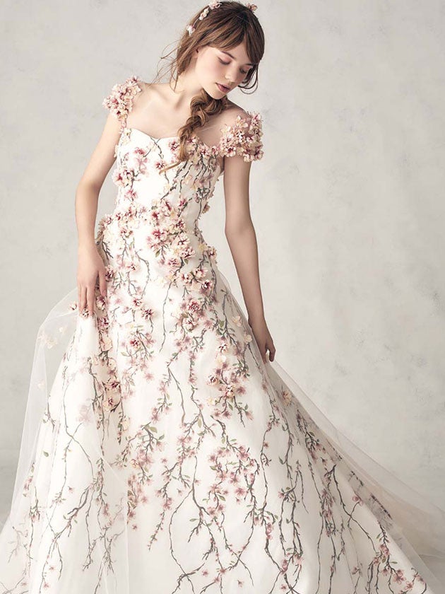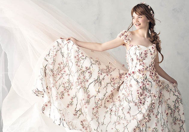 ウェディングシーンに合うようアレンジした桜をシルクタフタにプリントし、立体フラワーをあしらった、贅沢で華やかな洗練フラワープリントドレス。こんな時代だからこそ、見ているだけで幸せな気分にさせてしまう、ハッピーオーラを放つドレスをセレクトして!