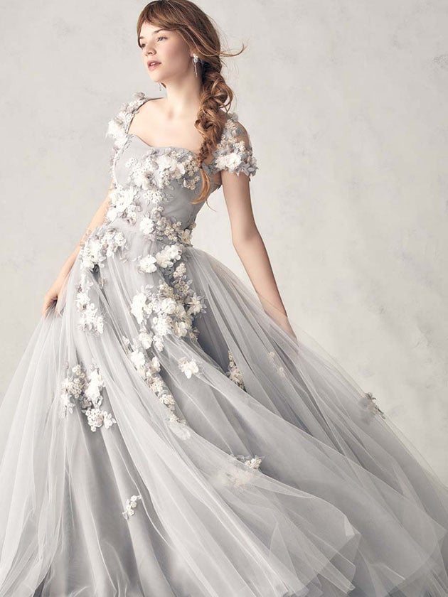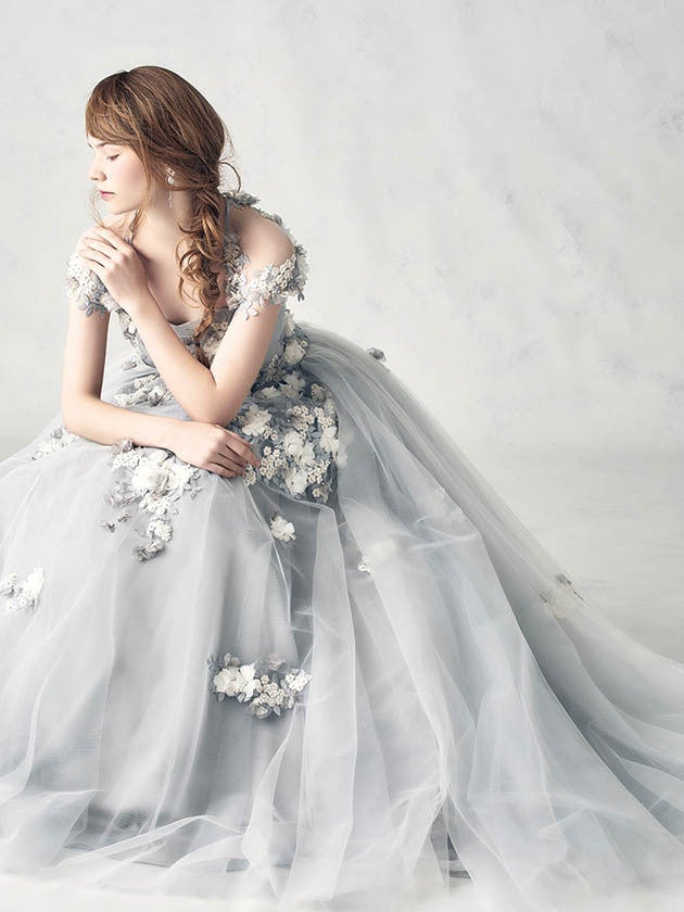 刺繍レースにパールやラインストーンをたっぷりほどこした王道ドレス。トレンドカラーのグレーは、ほんのりベージュの糸を織り込み、上品な輝きを放ちます。後ろ結びのボレロも新鮮なフォルムをつくりだす、こだわって仕上げた旬のカラードレスです。