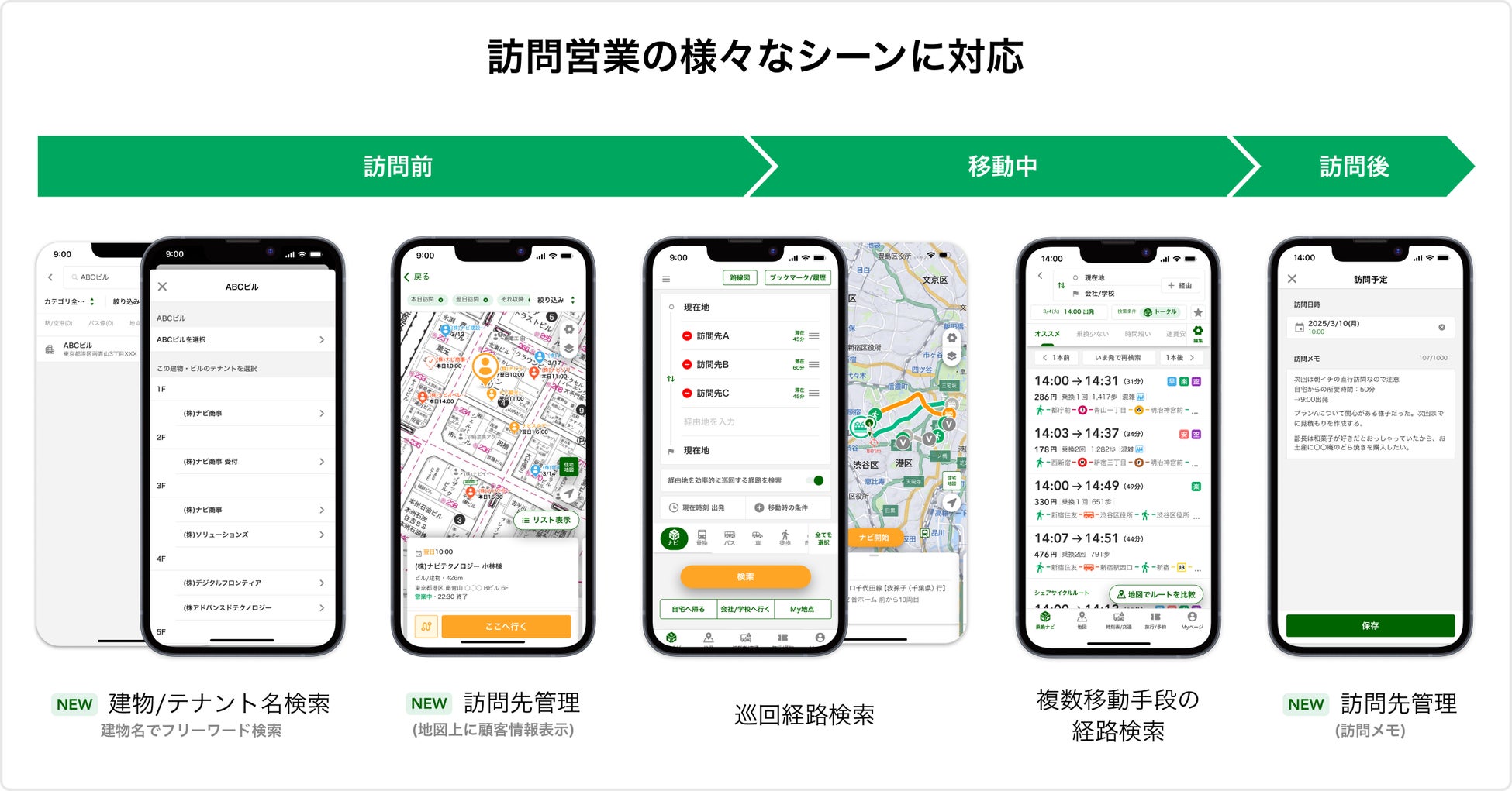 住宅地図やビル、テナント名称での検索、訪問管理機能で顧客訪問時の移動をサポート