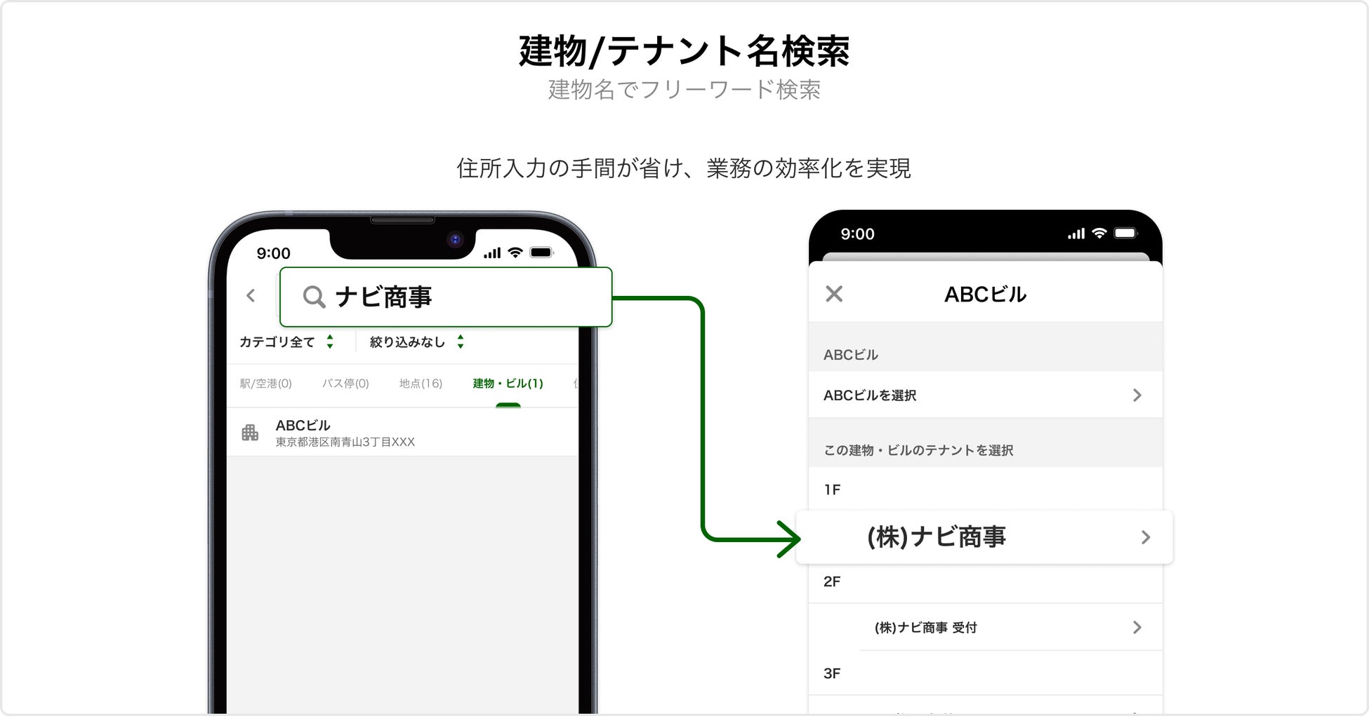 建物名称やテナント名を入力して地図検索やルート検索が可能で、検索結果ではマンション内の部屋番号やテナント等の一覧を確認できます。