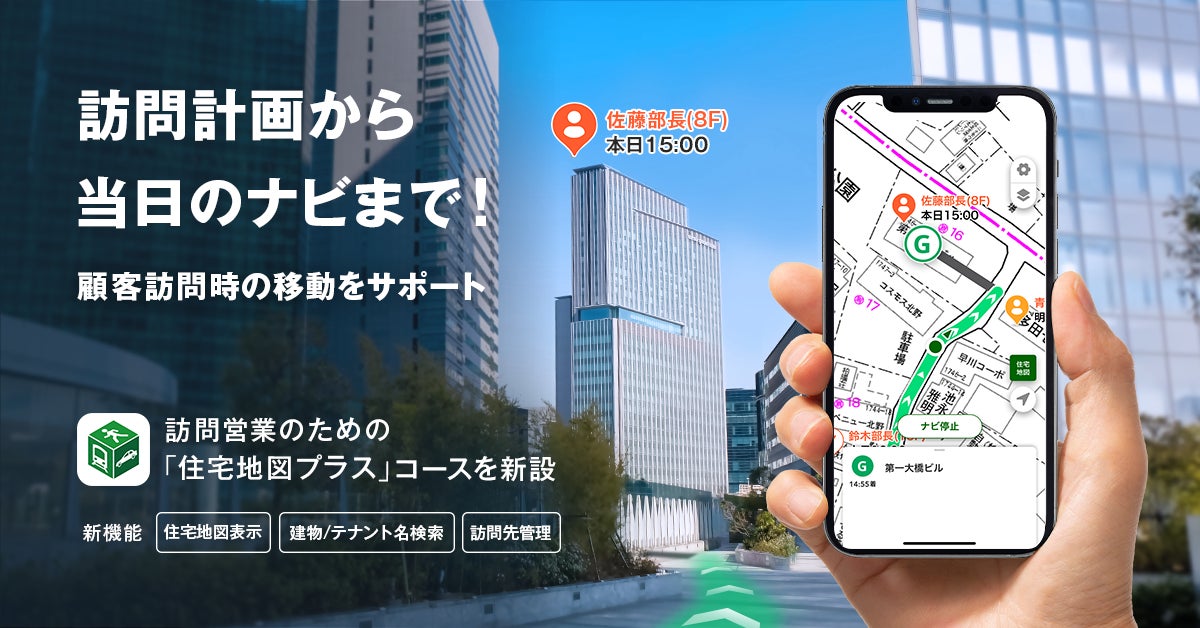 「住宅地図プラス」コースは、アプリ版およびPC版『NAVITIME』の「プレミアムプラス」コースの全機能に加え、住宅地図の表示、ビルやマンションの建物名称によるフリーワード検索、訪問管理機能などを備えた、個人宅やテナントを訪問するビジネスシーンでご活用いただけるプランです。月額2,300円(税込)で提供します。