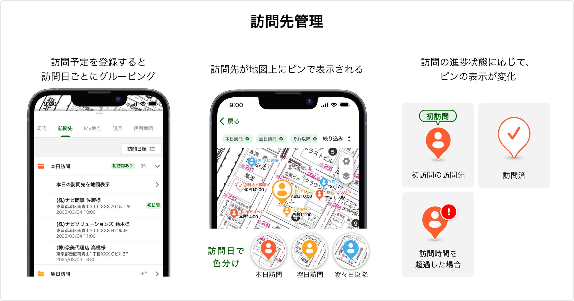 訪問予定の登録や訪問履歴を記録でき、訪問先をリストや地図上にピン表示にて確認できます。今日、明日、来週などの訪問予定単位での表示も可能で、初めて訪問する場所は「初訪問」アイコンで強調します。訪問後には地図上のピンの色が変わり、訪問時間を過ぎるとアラートするなど、訪問日や訪問ステータスに応じてお知らせします。