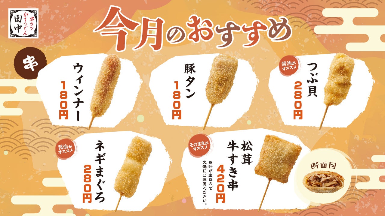 「つぶ貝」や、湯葉に松茸と牛すき焼きを巻いた「松茸牛すき串」といった旬の食材を楽しめる串カツや、「ピリ辛豚タン」や「馬刺し」などお酒に合う一品メニューの他、「ティラコ」(ティラミスコーヒーゼリー)といった串カツ田中でしか食べられないデザートメニューなど、期間限定メニューは12種類をご用意しています。