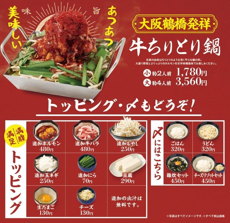 また、グランドメニューでは「鶏つくね~なんこつ入り~」といった串カツや、「タナ・カリー」といった新たな一品メニューの他、秋冬の定番メニュー「ちりとり鍋」が今年は「牛ちりとり鍋」にリニューアル、さらに新たなドリンクメニューなど、計6種類が追加となります。