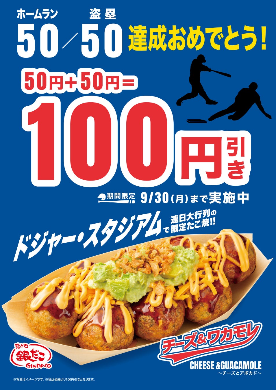 【 大谷翔平 50/50 達成記念キャンペーン! 】ドジャースファミリー「築地銀だこ」が、明日9/21(土)より、限定商品の100円引きを実施!